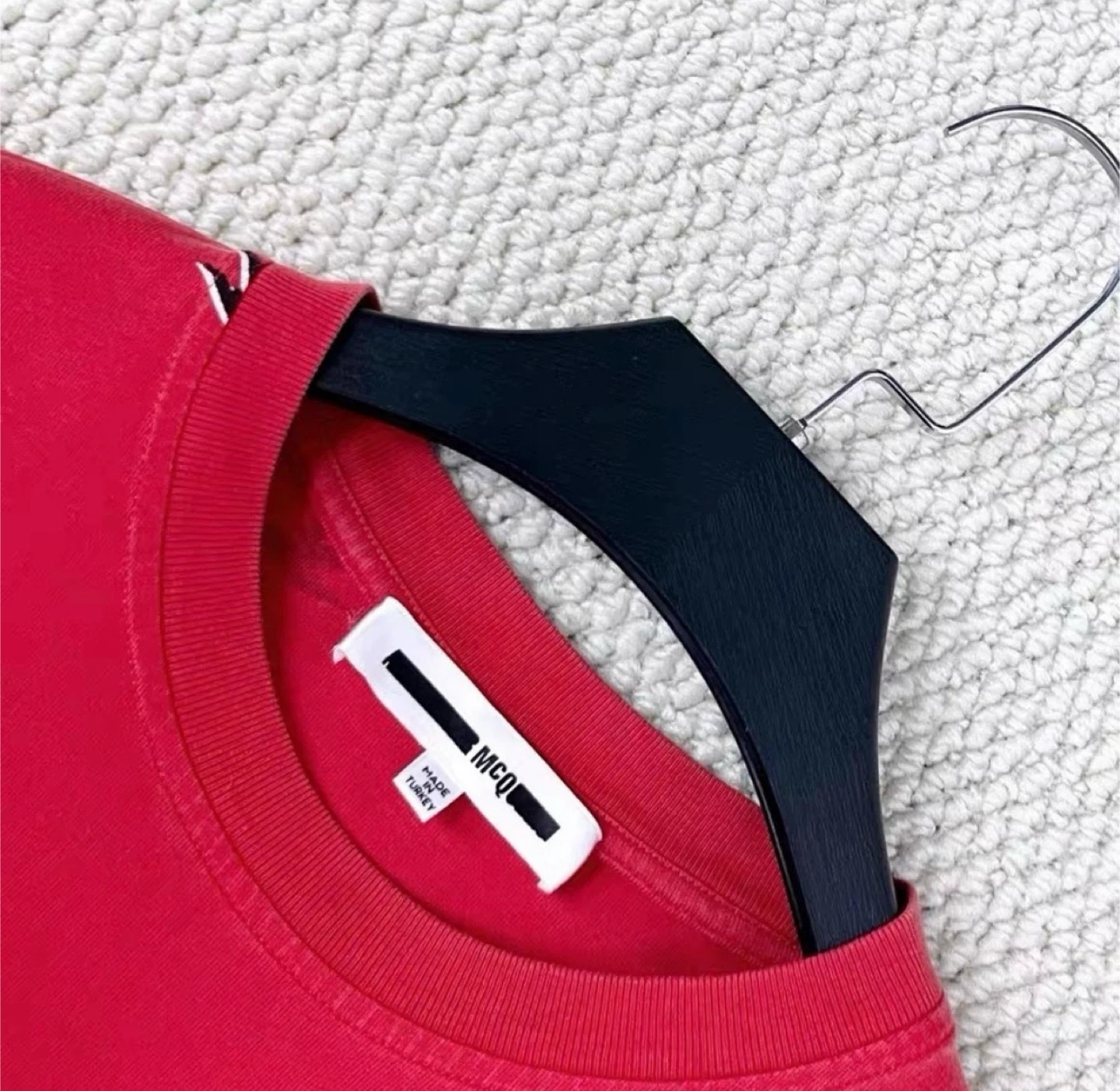 This is an MCQ red t-shirt dress with a swallow print. It's made in Turkey. Size small.
