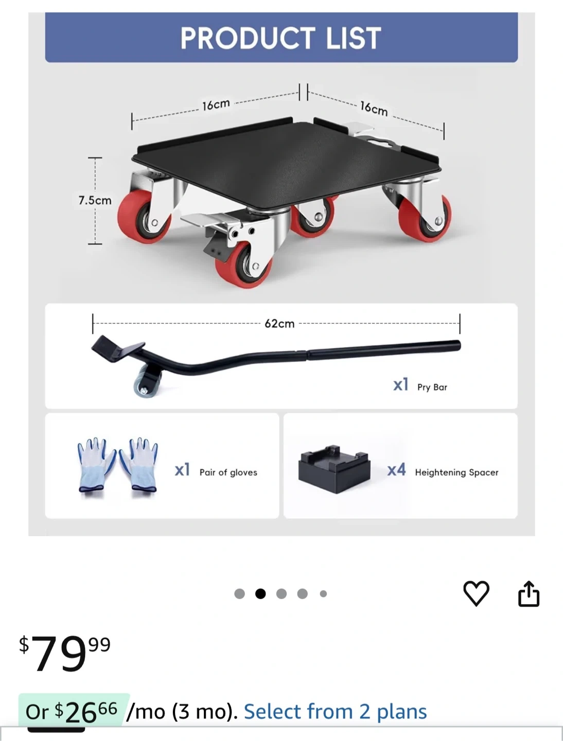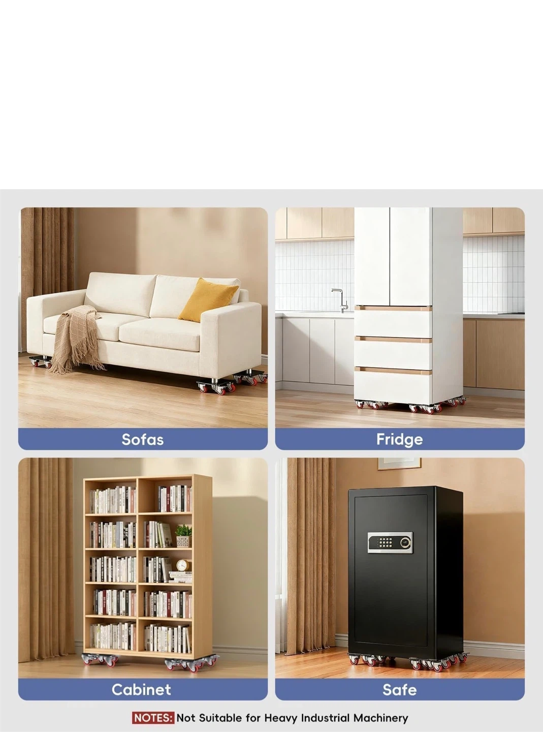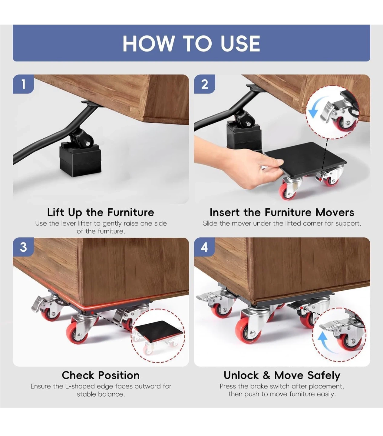 This furniture dolly set includes 5 x 360° rotation wheels and a pry bar. It's designed for moving heavy furniture and appliances with ease. The set also comes with a pair of gloves and heightening spacers. This is useful for repositioning heavy items around your home!