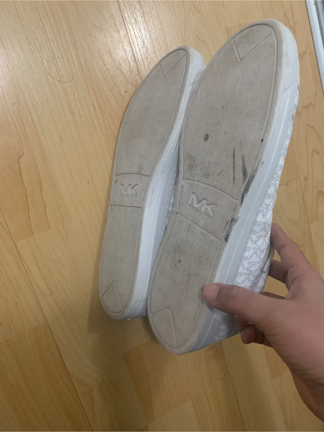 These Michael Kors sneakers feature the all-over MK logo print in white. They have a classic lace-up design with a comfortable low-top silhouette. The soles show some signs of wear, consistent with normal use.