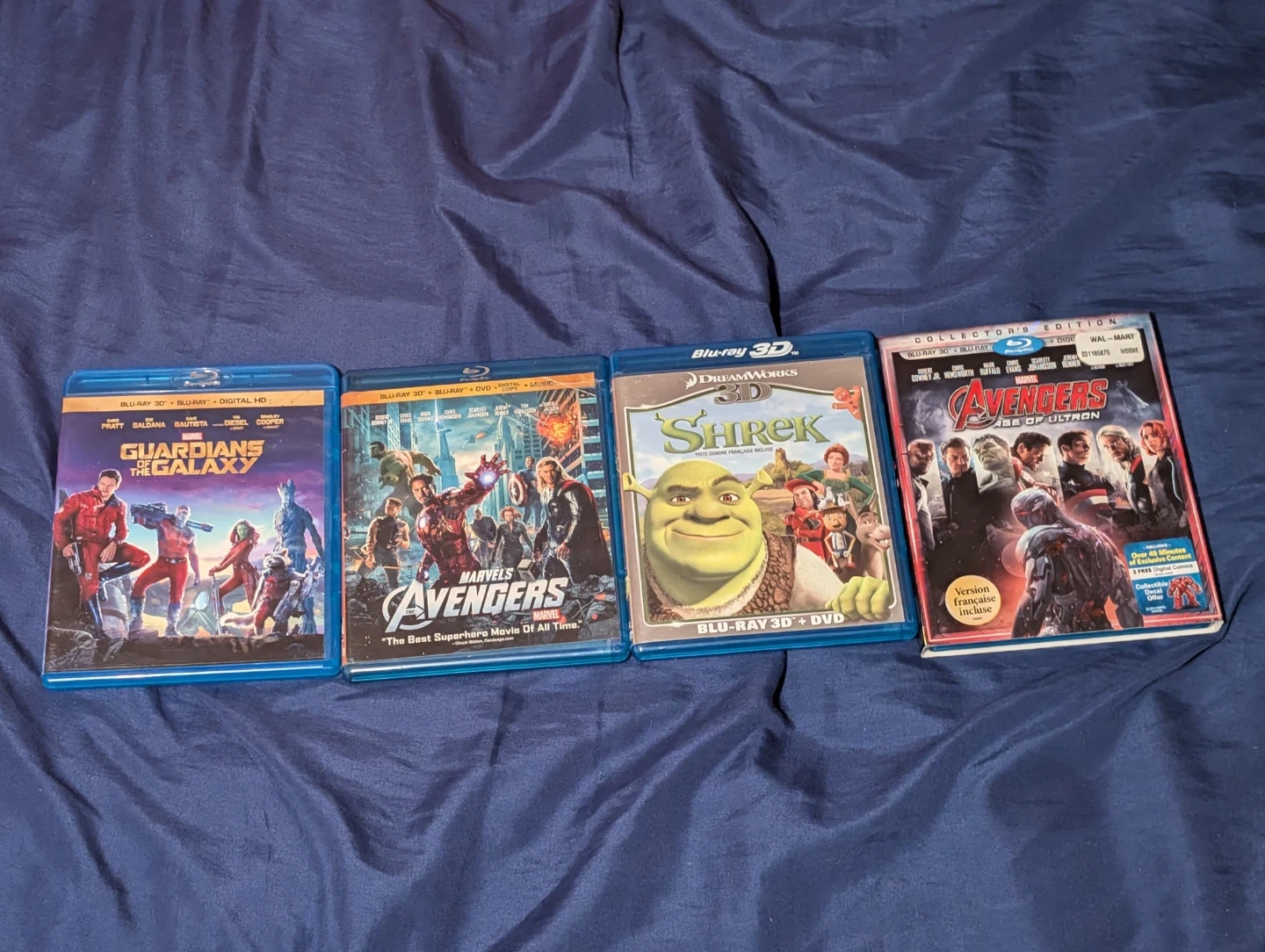 Guardians of the Galaxy Blu-ray 3D, Avengers Blu-ray 3D, Shrek Blu-ray 3D + DVD, and Avengers: Age of Ultron Collector's Edition Blu-ray 3D + Blu-ray. These are movie discs for your collection.