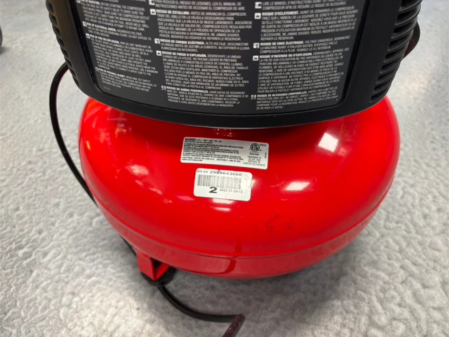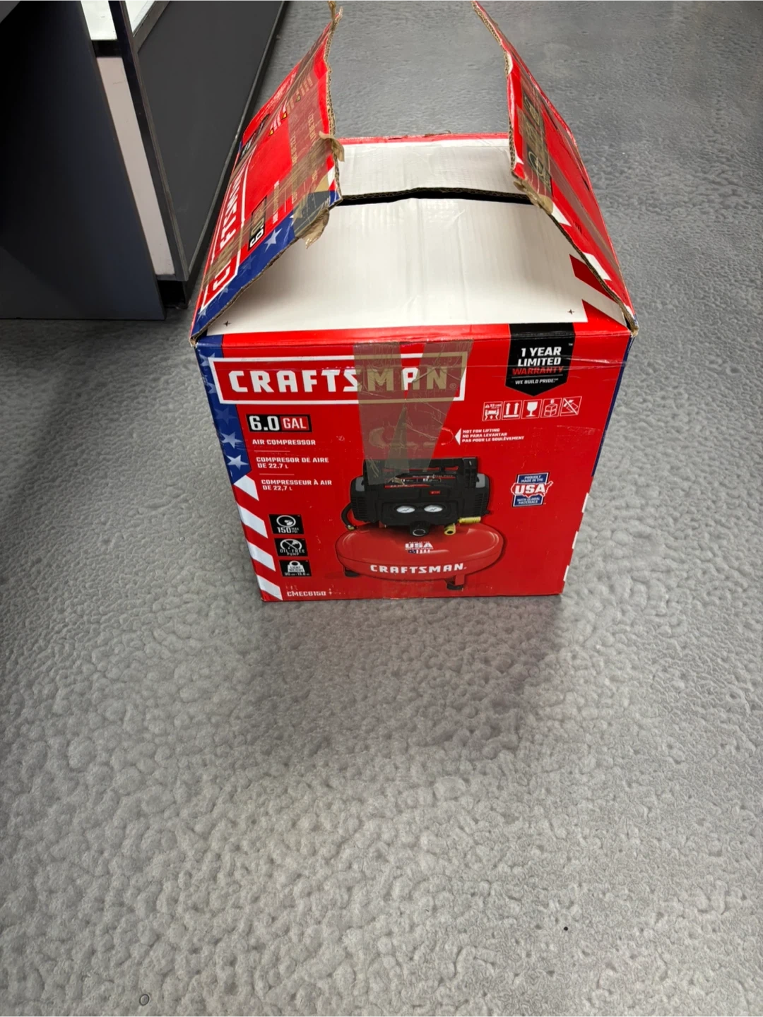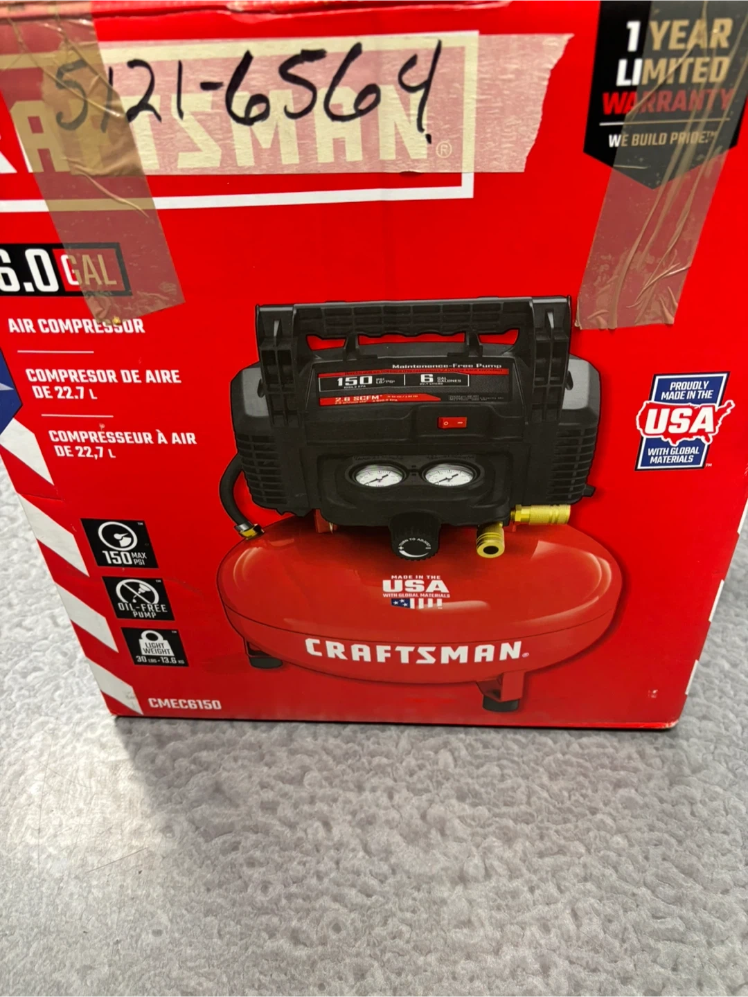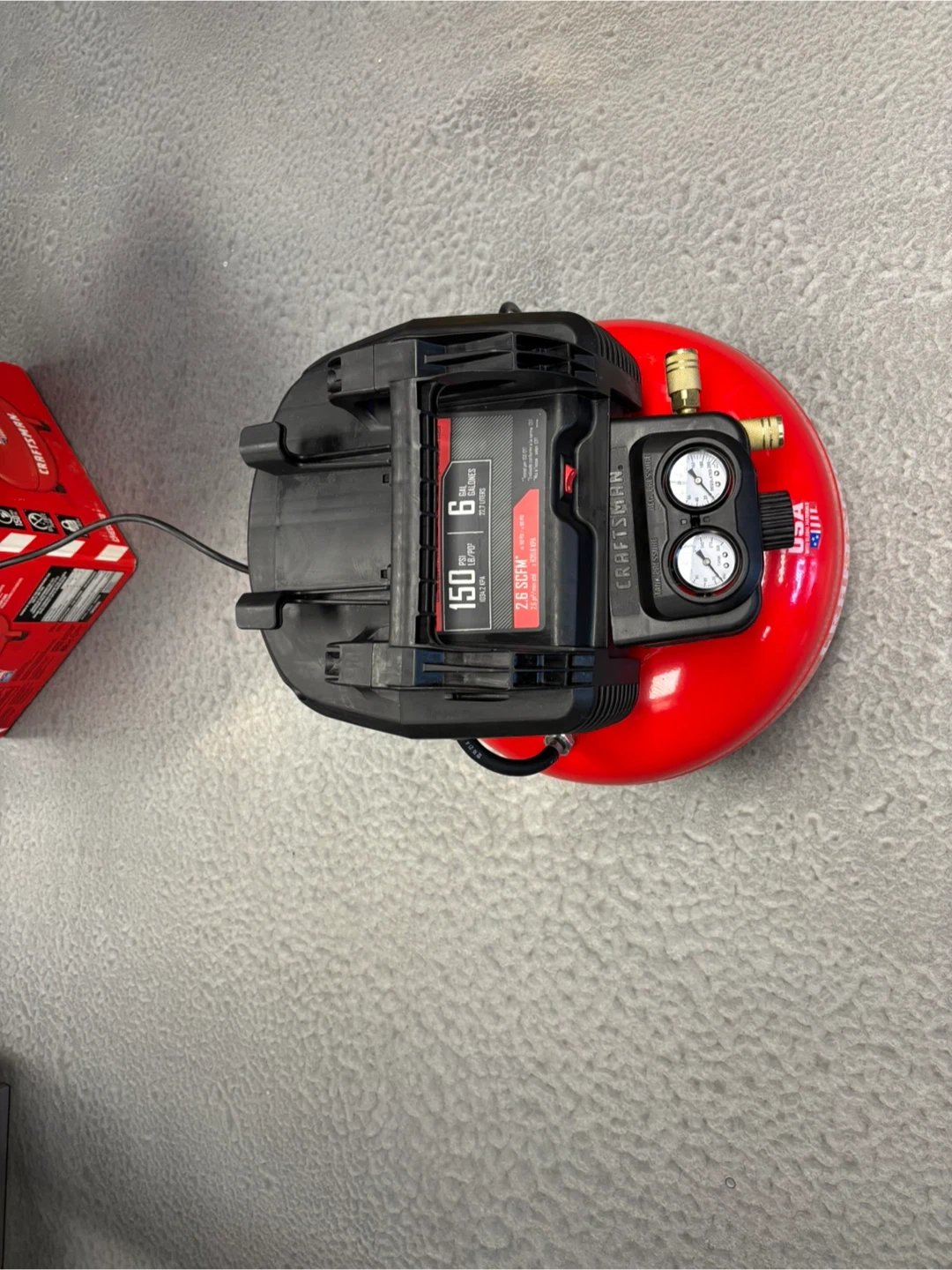 This Craftsman 6-gallon air compressor has a 150 PSI max pressure. It delivers 2.6 SCFM at 90 PSI and is maintenance-free. The tank is 6 gallons. Brand new. If you like to come and test the compressor before purchase, I am located at. 410 16 Ave NE Trans-Canada Building