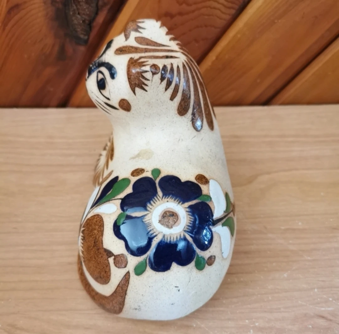 Beautiful vintage Tonalá pottery cat from Mexico, featuring traditional hand-carved detailing and vibrant cobalt blue and green floral accents. Crafted in heavy earthenware with a warm cream matte glaze, this piece reflects classic mid-century Tonalá folk art design.
