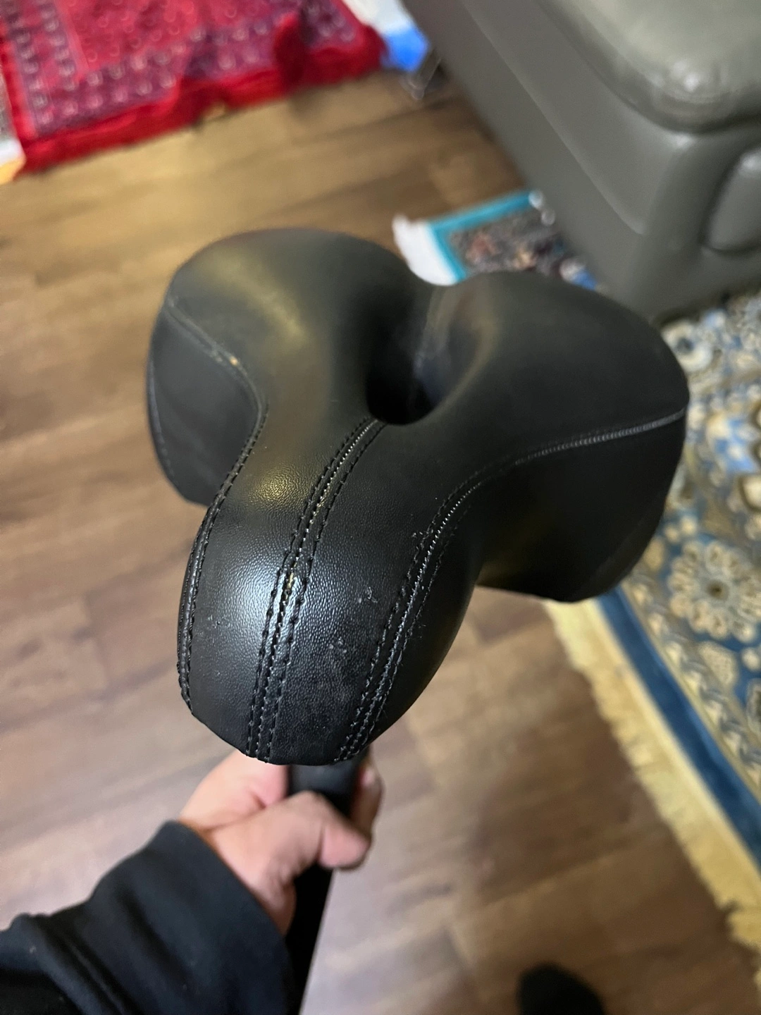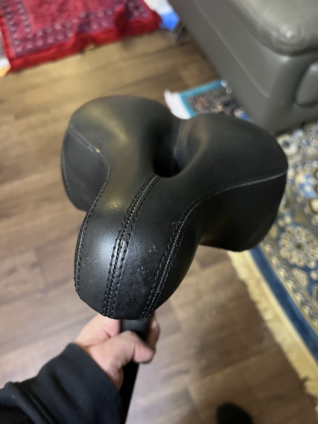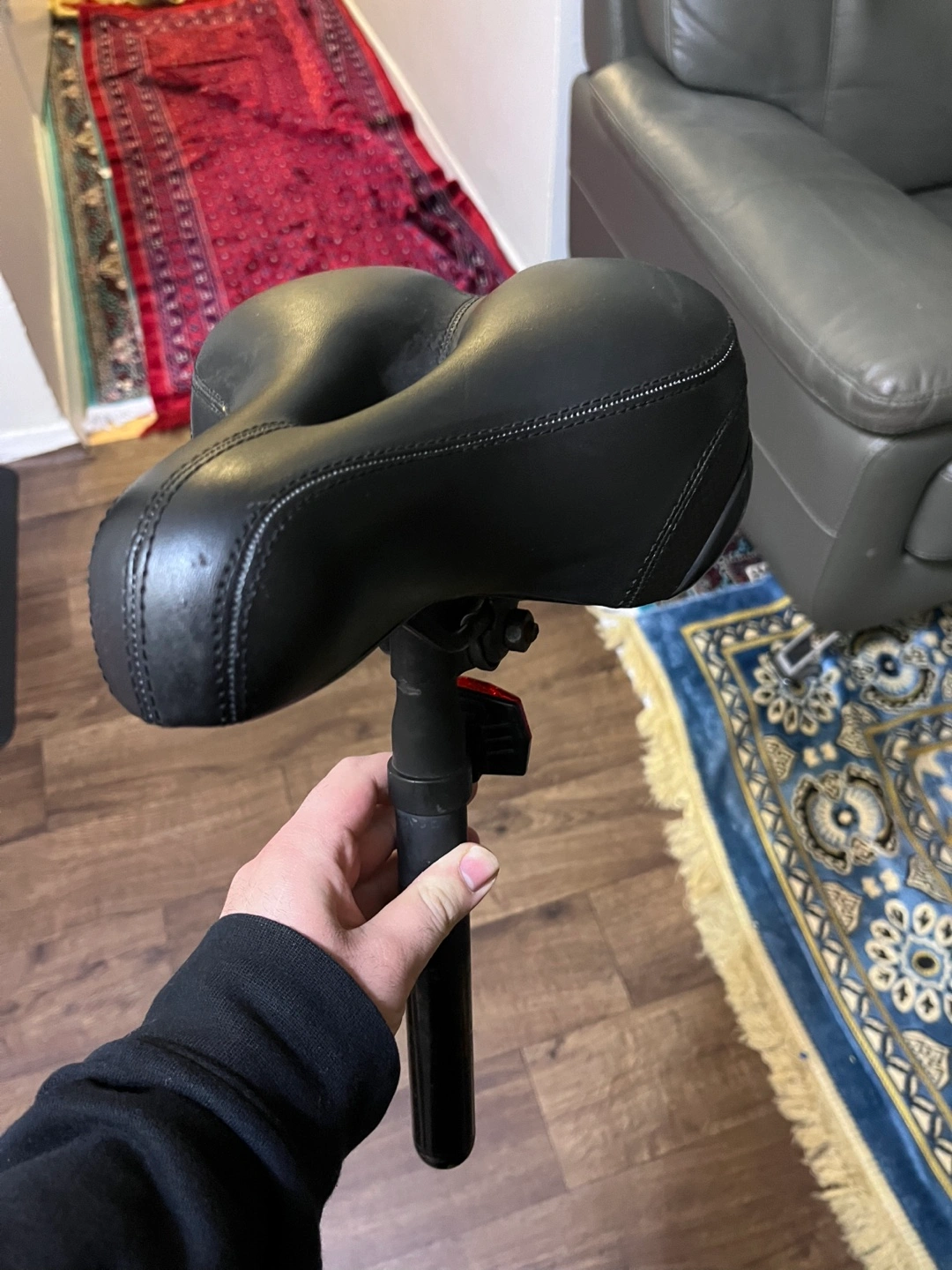 Selling a bicycle seat with pole in good condition. It's black and has a unique shape for comfort. Wide foam Perfect if you're looking to replace your current seat or upgrade