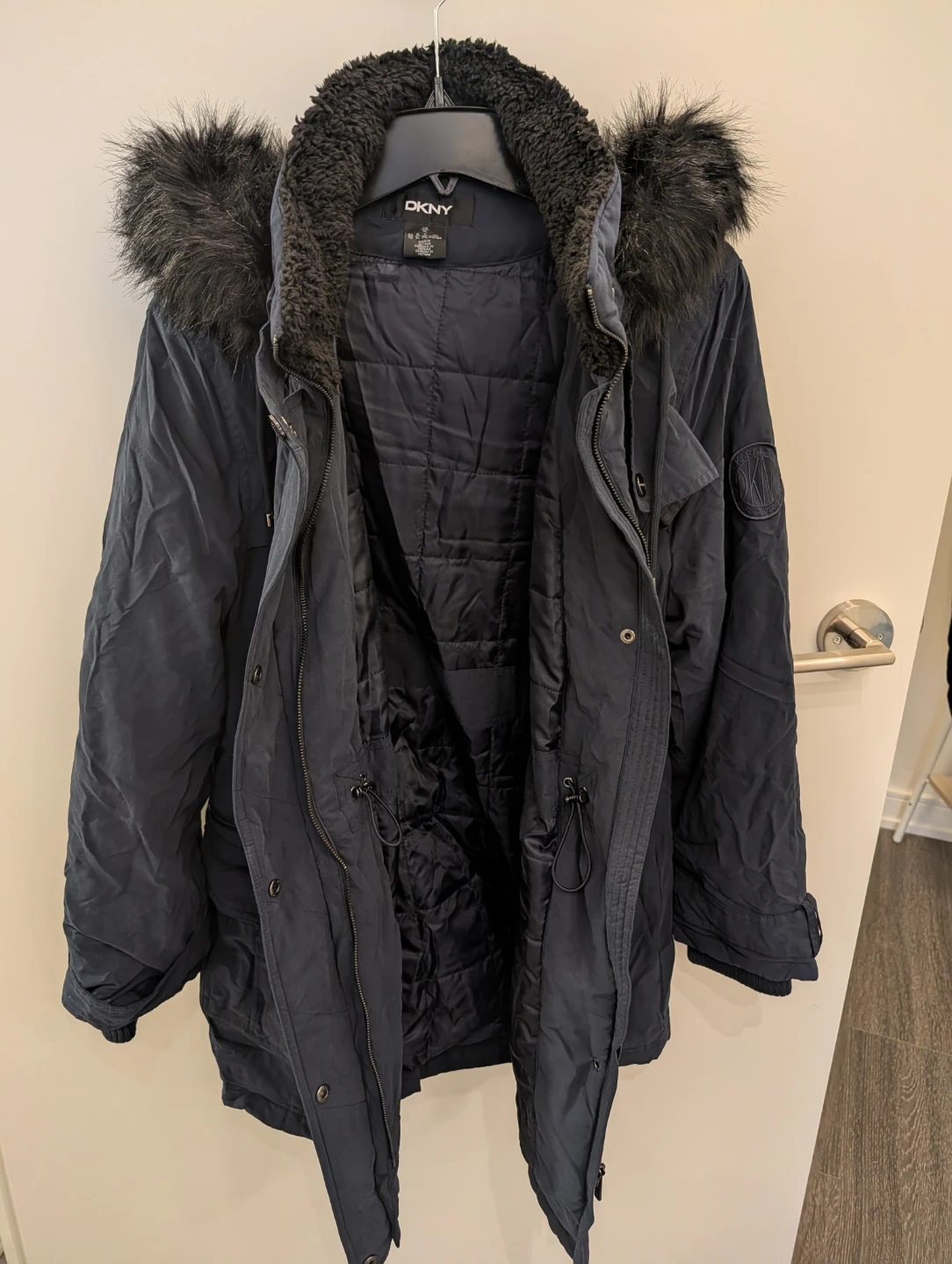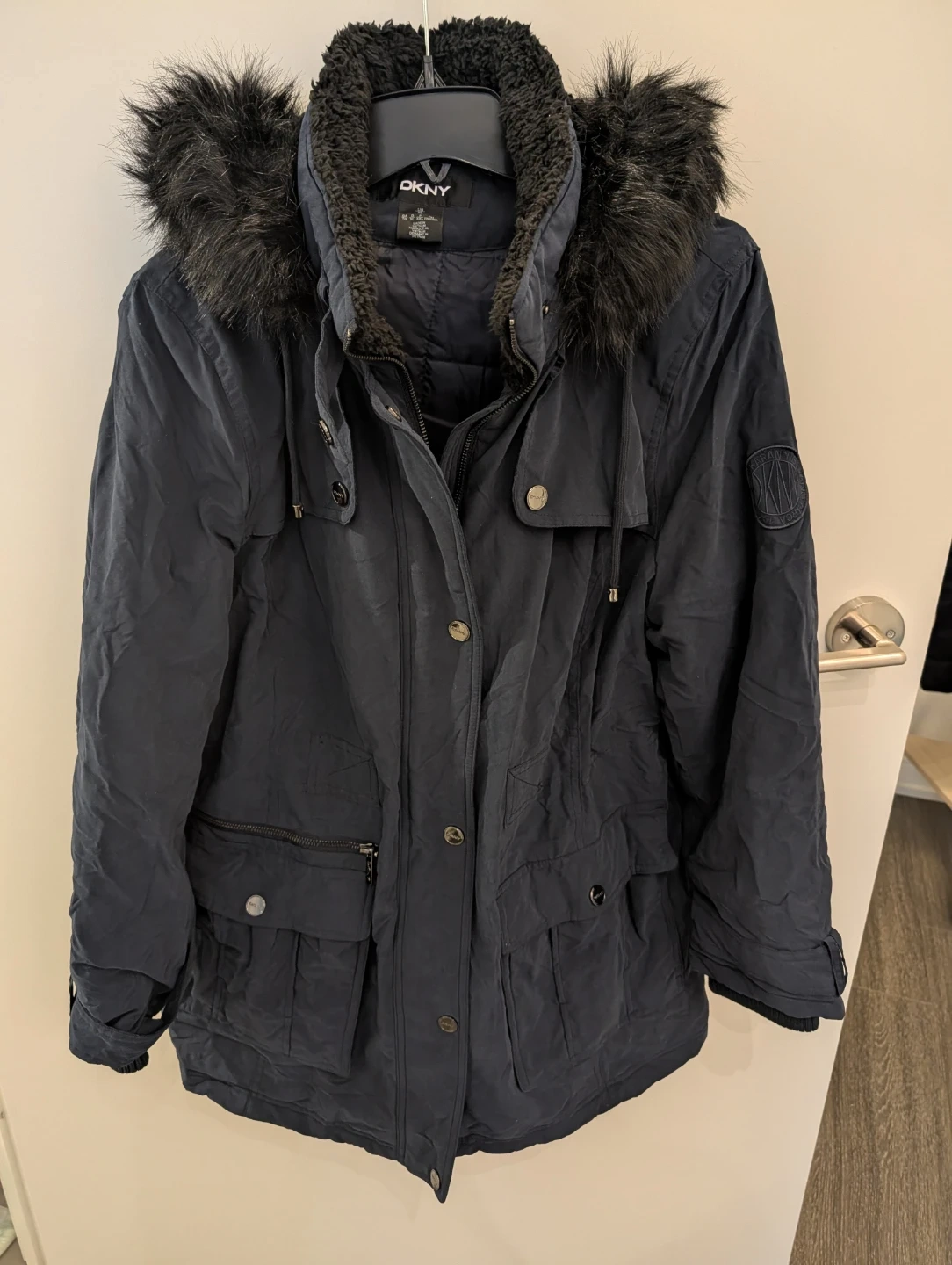 This DKNY parka is navy blue with a faux fur-lined hood. A warm winter jacket with multiple pockets.