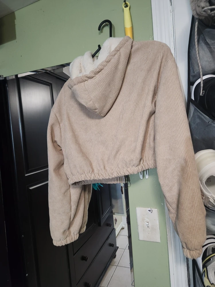 Cozy up in this corduroy jacket featuring a soft sherpa lining! It's a stylish and comfortable piece, perfect for adding a touch of warmth to your outfit. The jacket has a hood and a zip-up front, making it easy to layer. It's in great condition and ready for a new home!