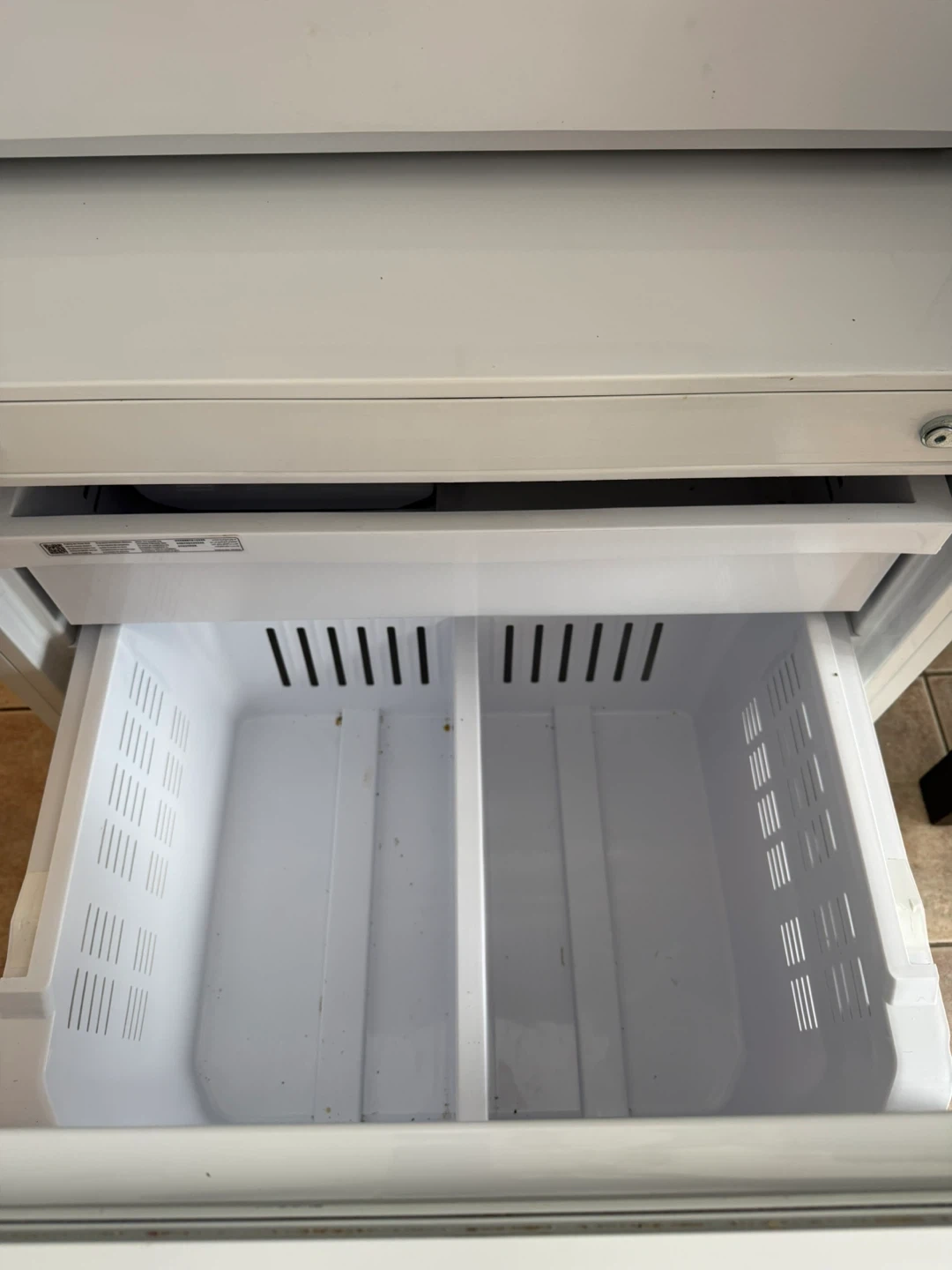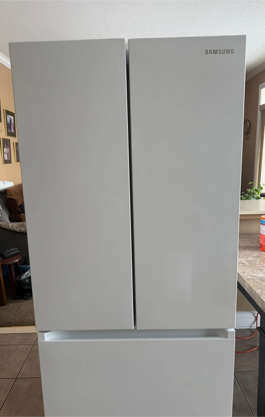 White Samsung French door refrigerator. It's a 22 cu. ft. model with "All-Around Cooling" and ice making function. Manufactured January 2022. Dimensions are 70 7/8" H x 29 7/8" W x 34 7/8" D.