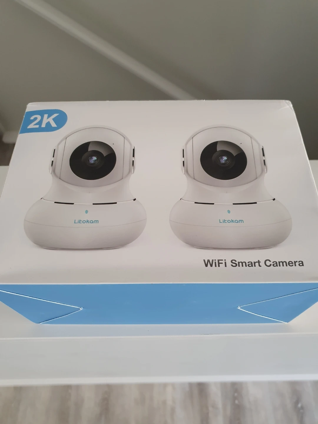 Unopened Litokam 2K WiFi Smart Cameras. This is a two-pack of white smart cameras. They connect via WiFi.