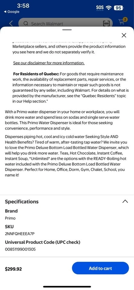 Primo Deluxe Bottom Load Bottled Water Dispenser, Black