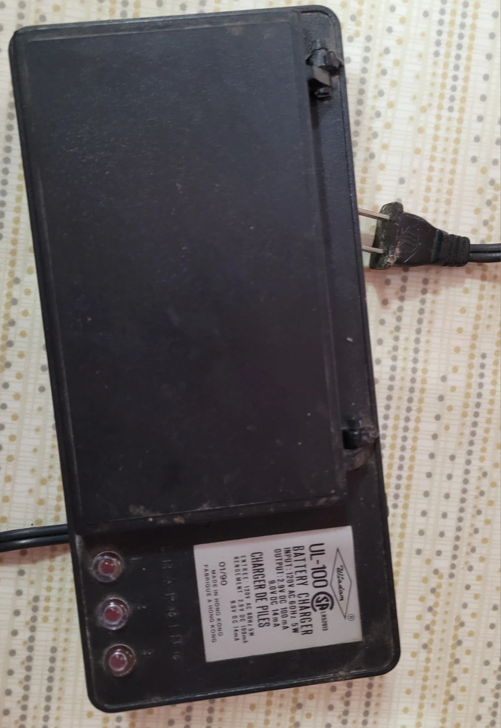 Wisdom UL-100 battery charger for nickel-cadmium A, AA, C, D & 9 volt cells. Input 120V AC 60Hz 5W. Output DC 14mA. Charges 4 batteries at once. Made in Hong Kong.
