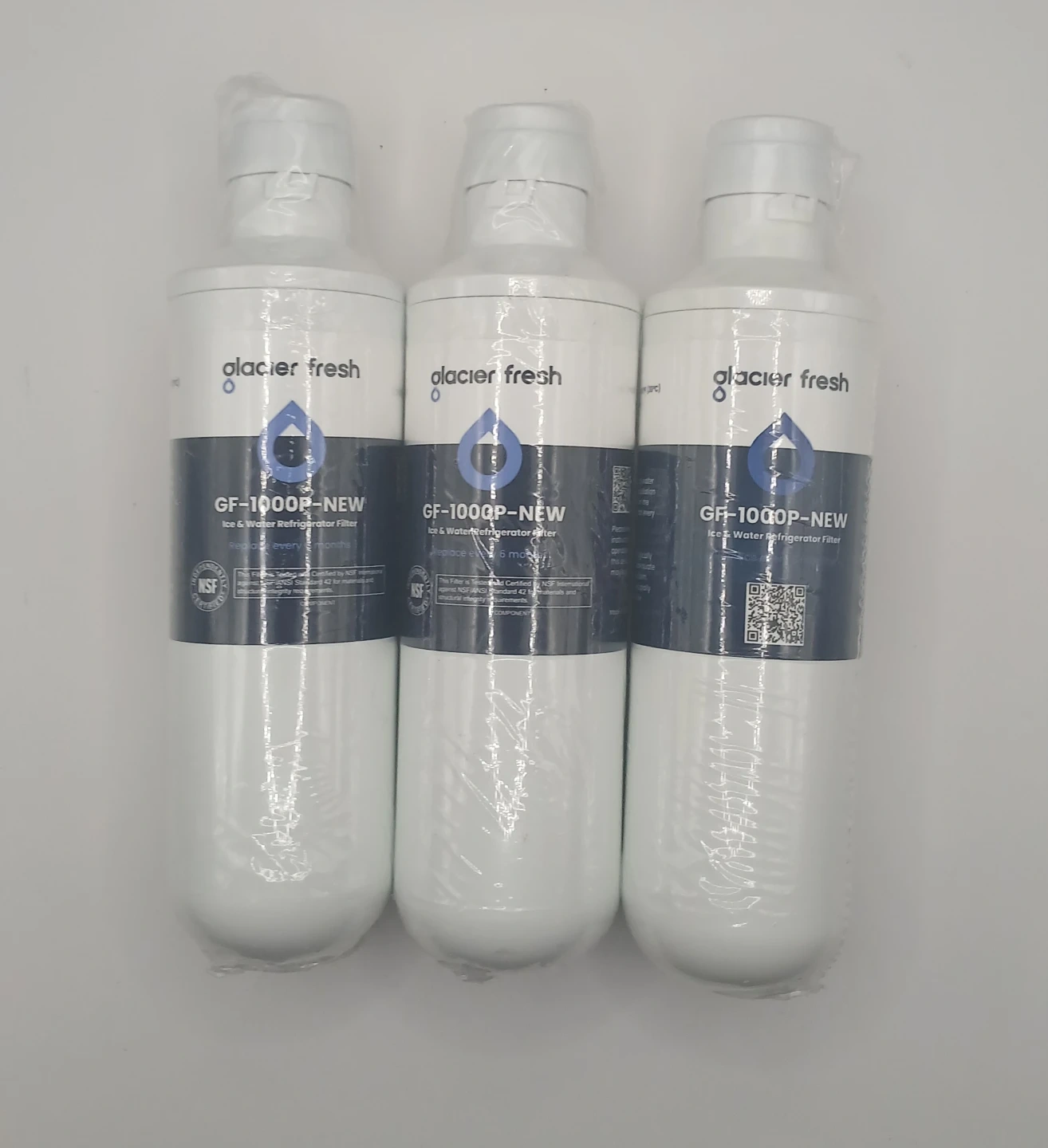 Three Glacier Fresh GF-1000P-NEW ice and water refrigerator filters compatible with LG 1000P filters. These filters are NSF certified for materials and structural integrity. Replace every six months!