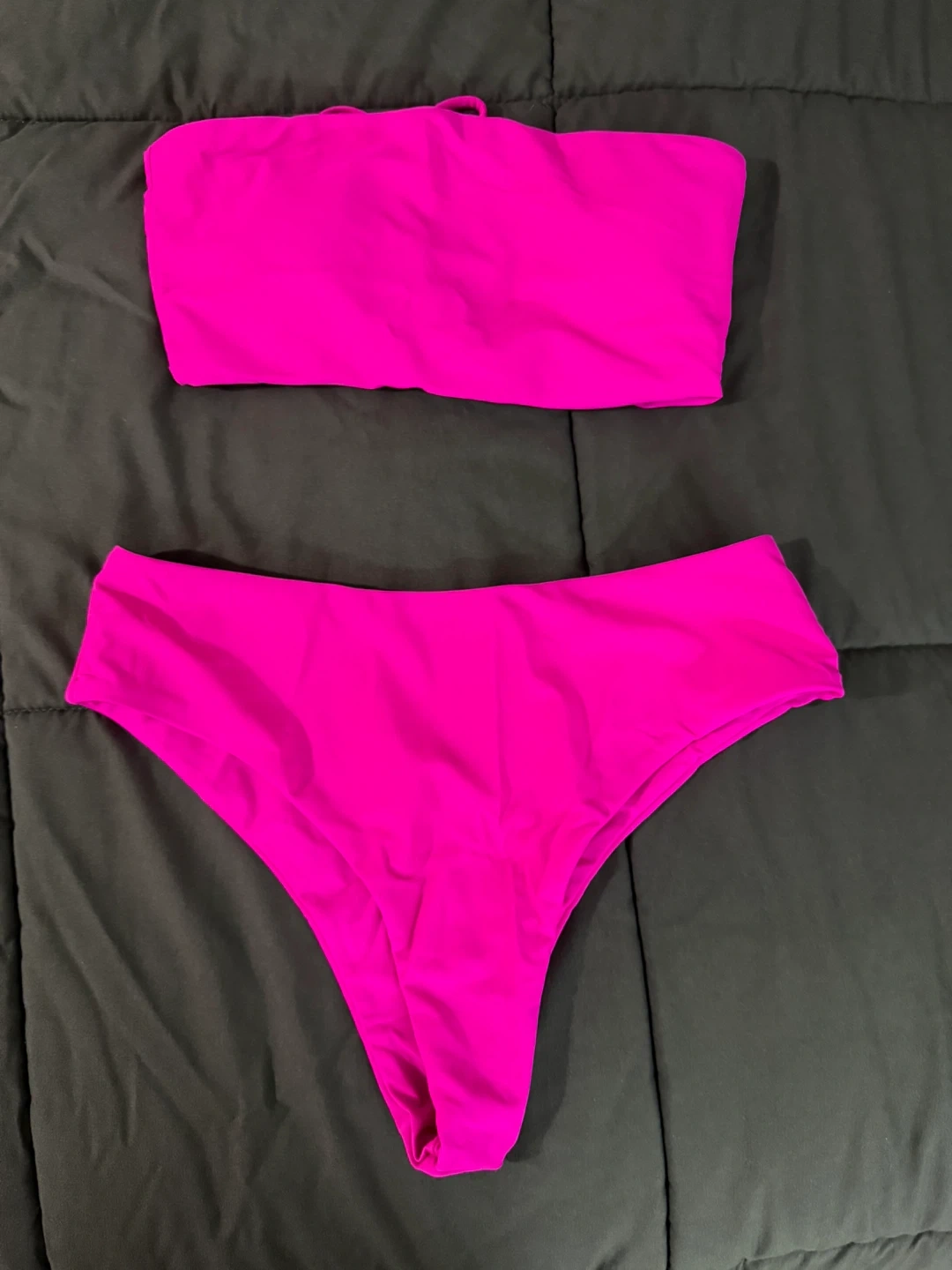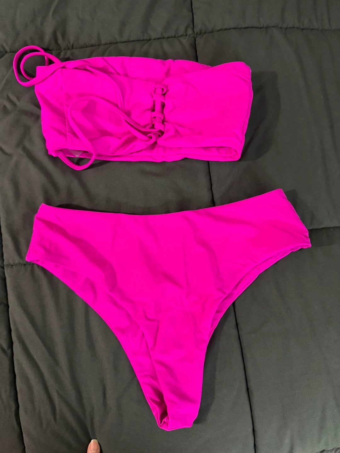 A two-piece bikini set in a vibrant hot pink colour. It's a strapless bandeau top with a lace-up front and high-waisted bottoms. This set is perfect for sunny days at the beach or pool!