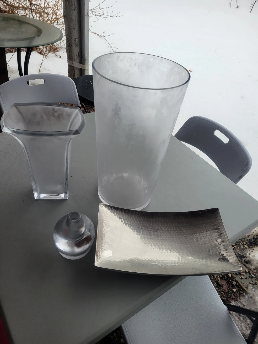 Decorative set including a hammered silver tray, a large frosted glass vase, a smaller clear glass vase, a round glass stoppered bottle, and a yellow ceramic lidded jar. Also includes three decorative spheres with a beaded texture.