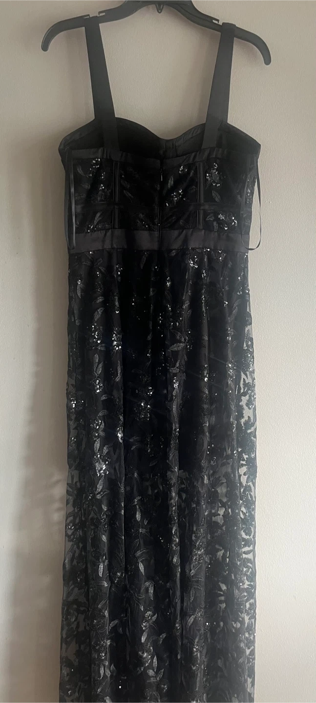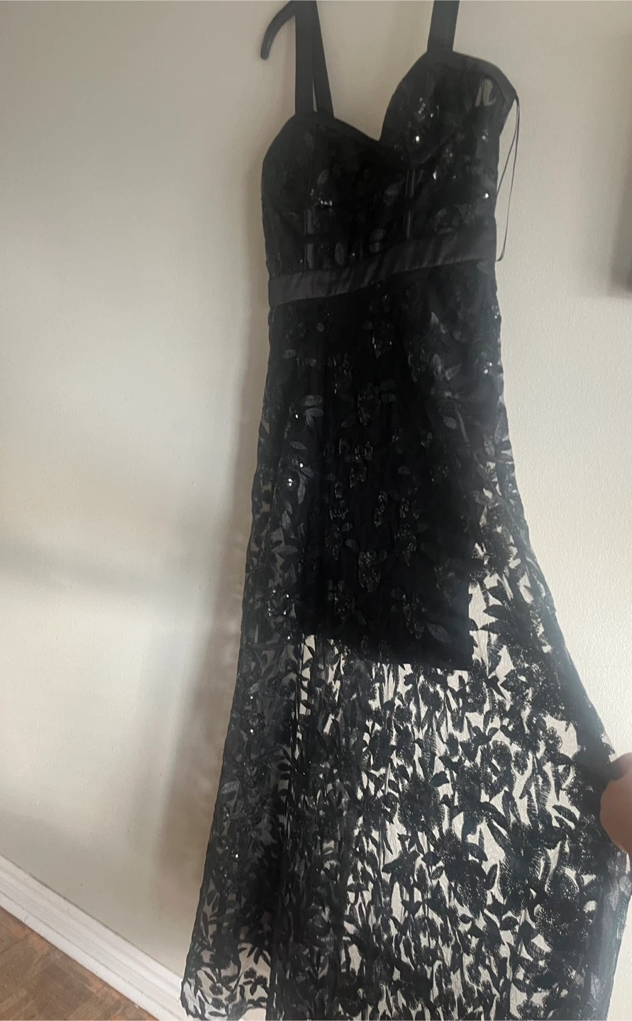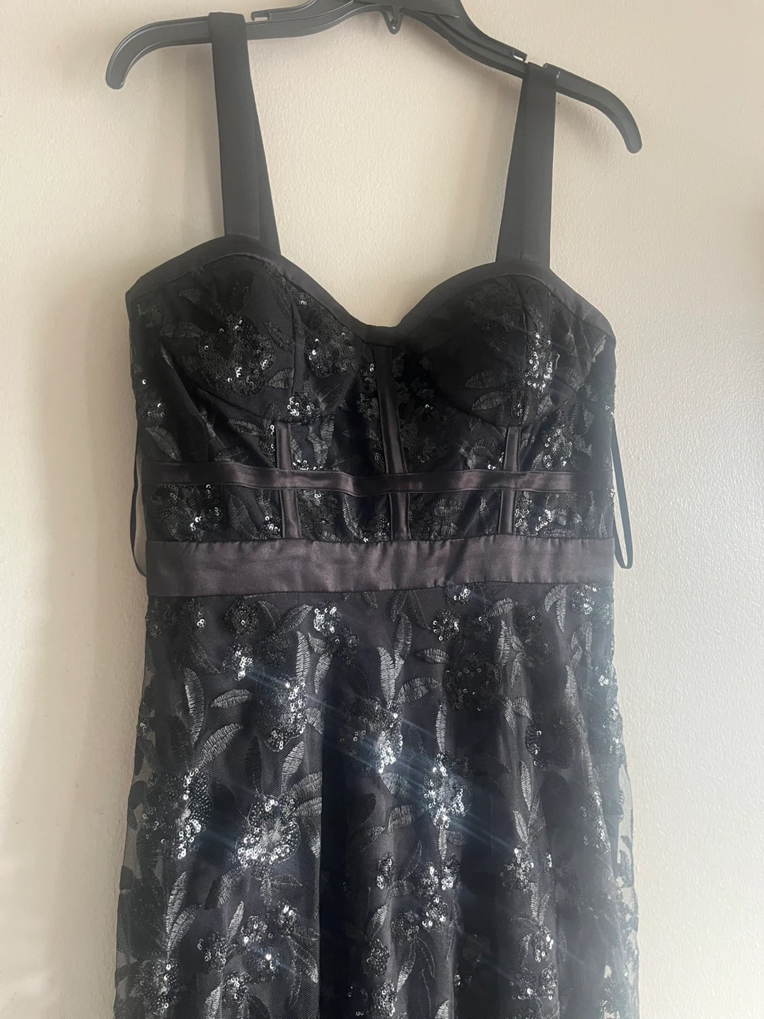 This black party dress features a sweetheart neckline and sequin lace detailing. It has a zip-up back closure. Perfect for a formal event or a night out!