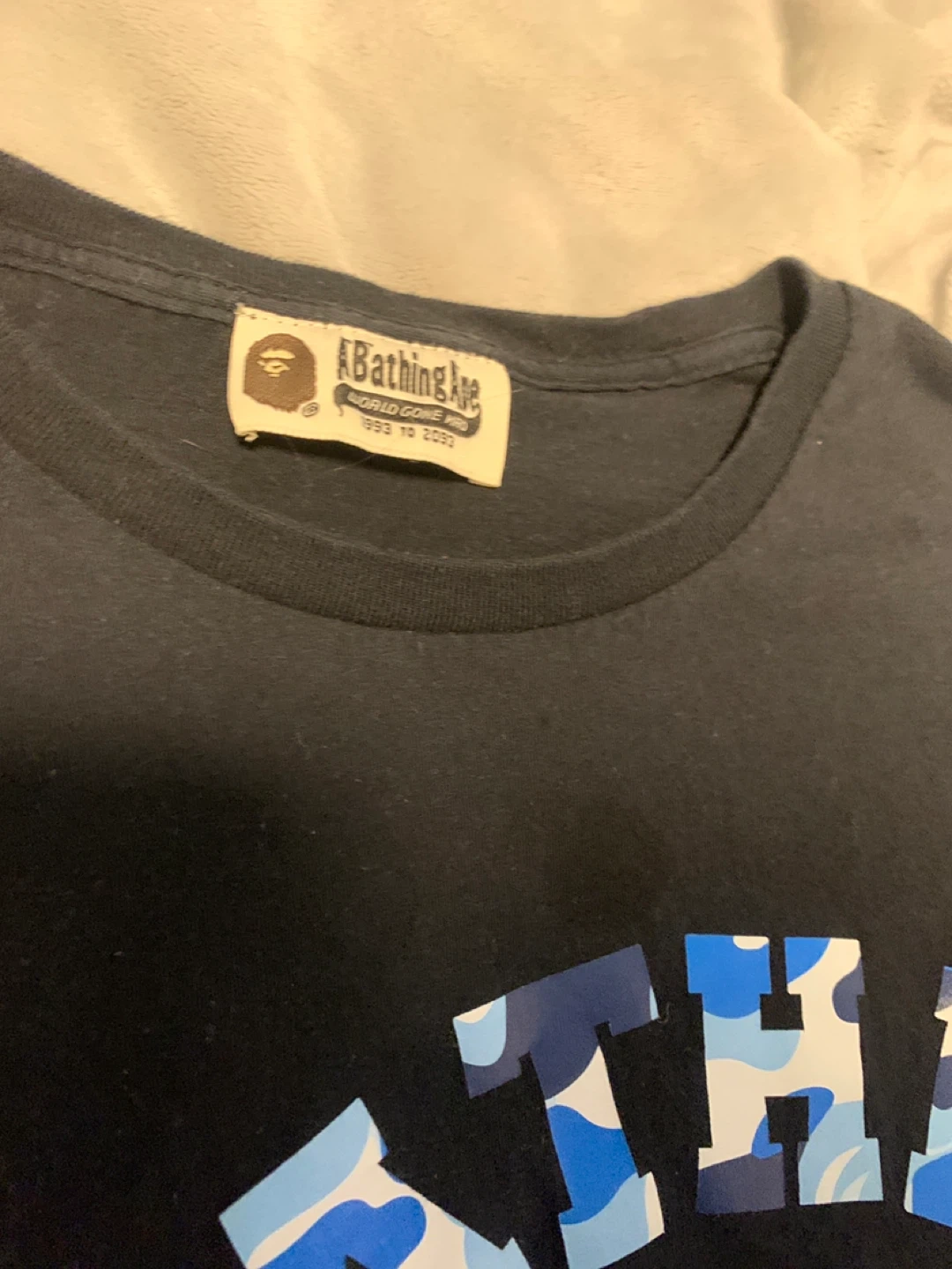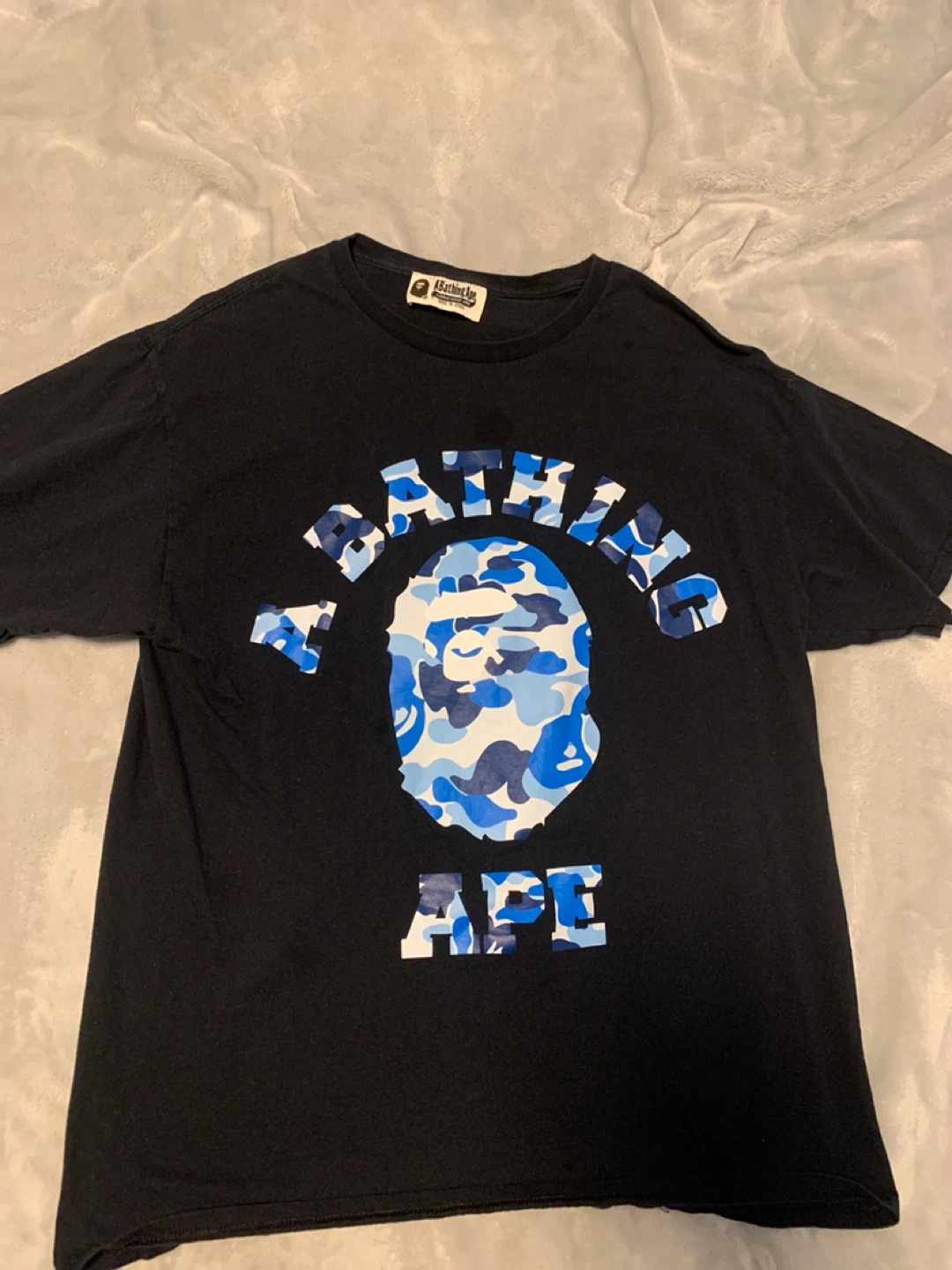 A Bathing Ape, also known as BAPE, black T-shirt with a blue camo design. It's in great condition, ready for a new home! Feel free to ask any questions