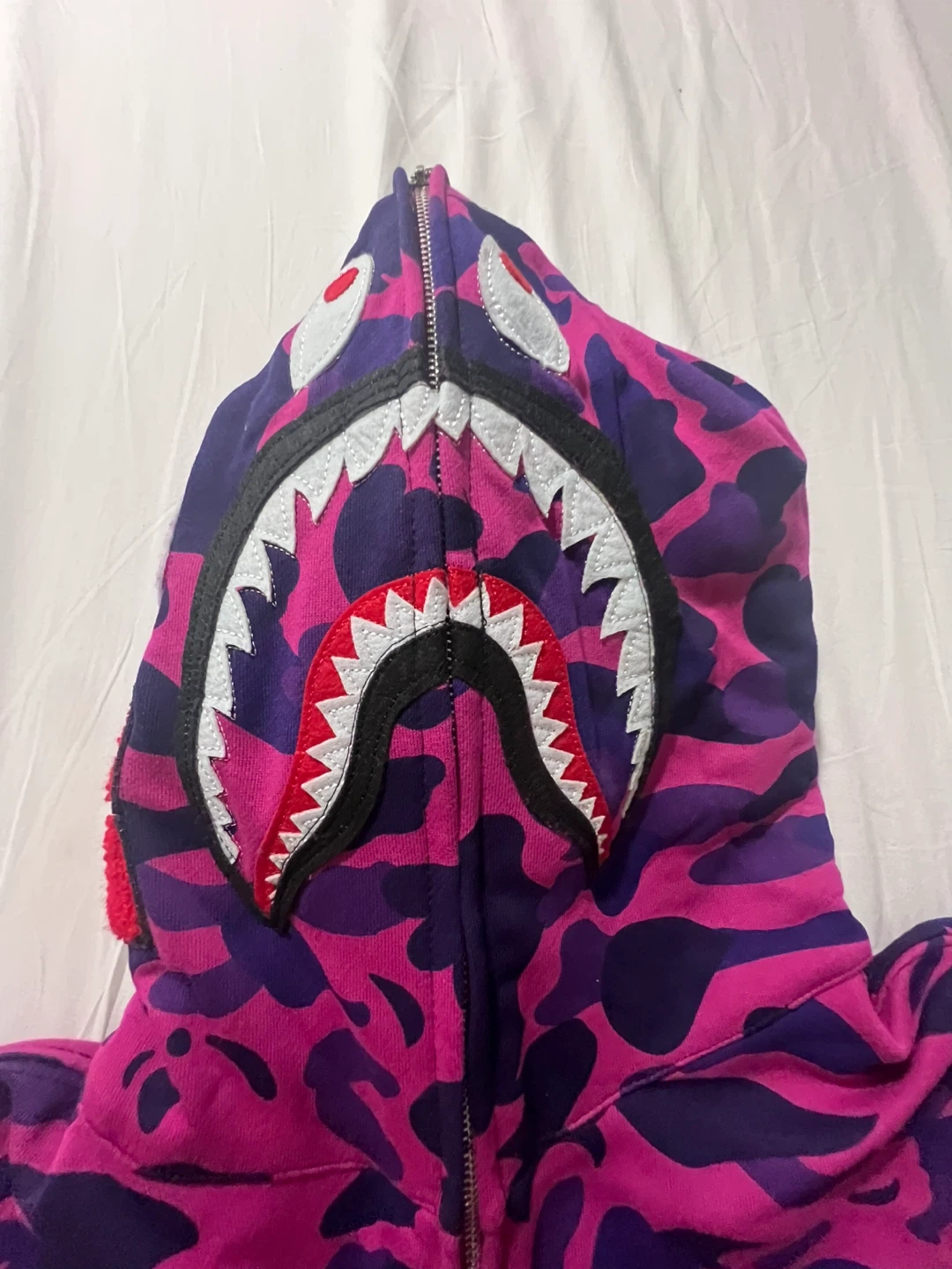 15Selling a brand new A Bathing Ape (BAPE) shark hoodie in a purple camo pattern. It's a size medium and comes in the original packaging. This hoodie is a real statement piece!