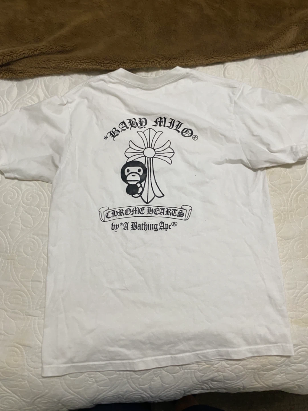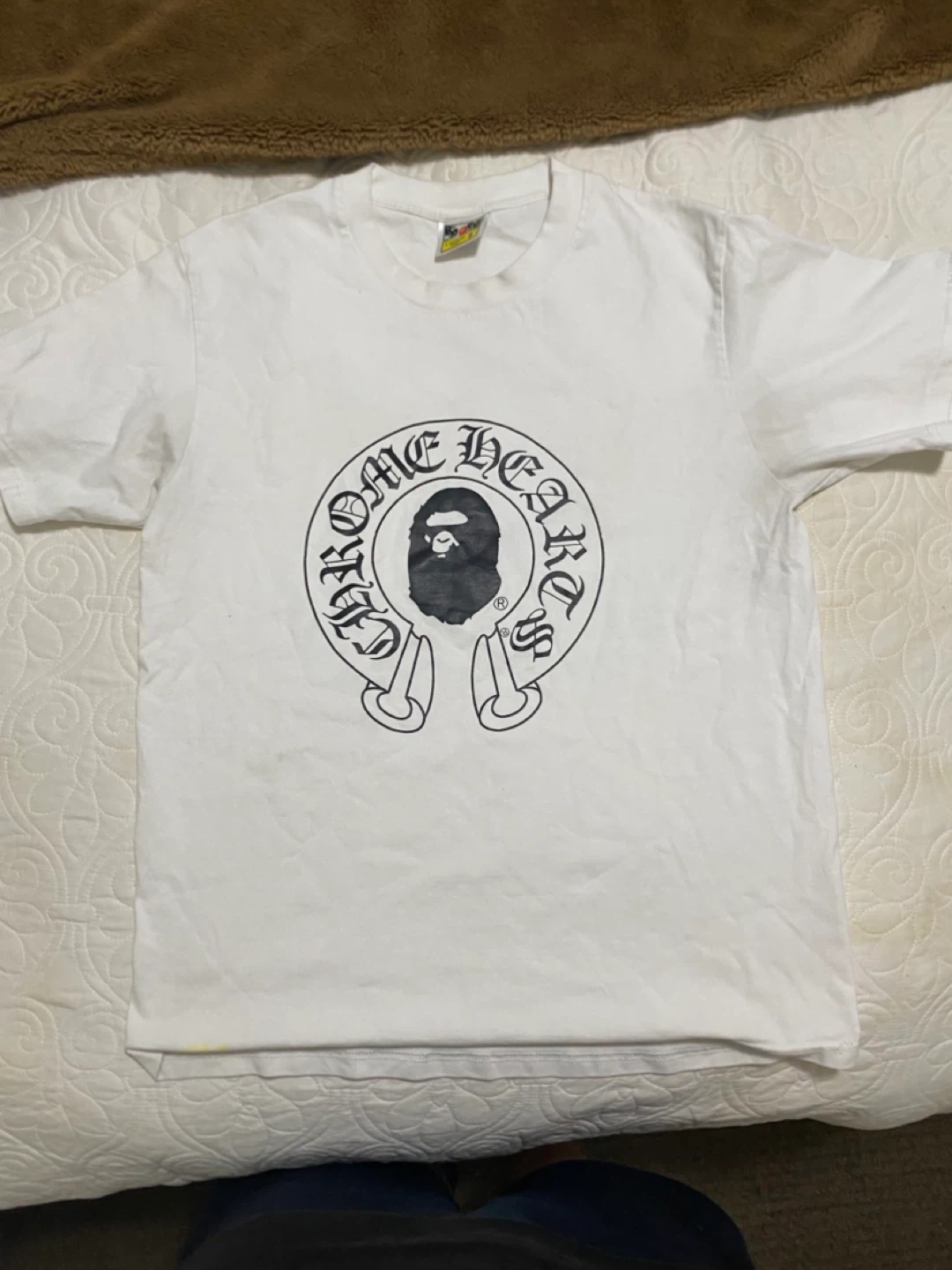 10Selling a Bathing Ape (BAPE) x Chrome Hearts T-shirt in size small! This tee features a unique design collaboration between the two brands. It's white and has the iconic BAPE logo combined with Chrome Hearts' signature cross motif. Perfect for fans of streetwear and designer collaborations Comes with bag aswell