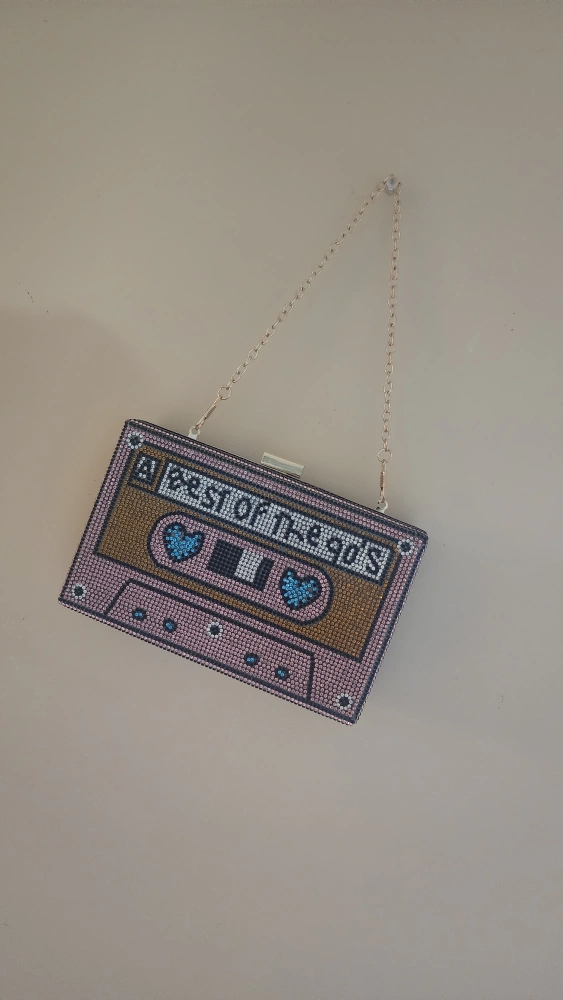 60Selling a super cute purse that looks like a cassette tape with "A Best of the 90's" on it! It's pink with a silver chain strap and bedazzled with rhinestones. Perfect for a fun night out!