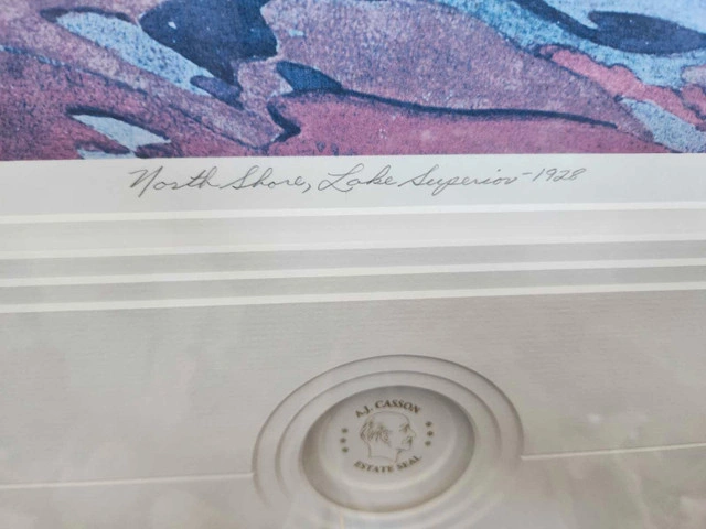 91This is a framed A.J. Casson print titled "North Shore, Lake Superior - 1928," a Heritage Edition, numbered 484/495. It is in excellent condition and ready to hang. Here are some details about the print: * Artist: A.J. Casson * Title: North Shore, Lake Superior - 1928 * Edition: Heritage Edition * Number: 484/495 * Framed and ready to hang Looking at similar A.J. Casson prints, a fair price for this piece would be in the $150-$300 range, considering its condition and collectibility. If the ad is up, it's available!