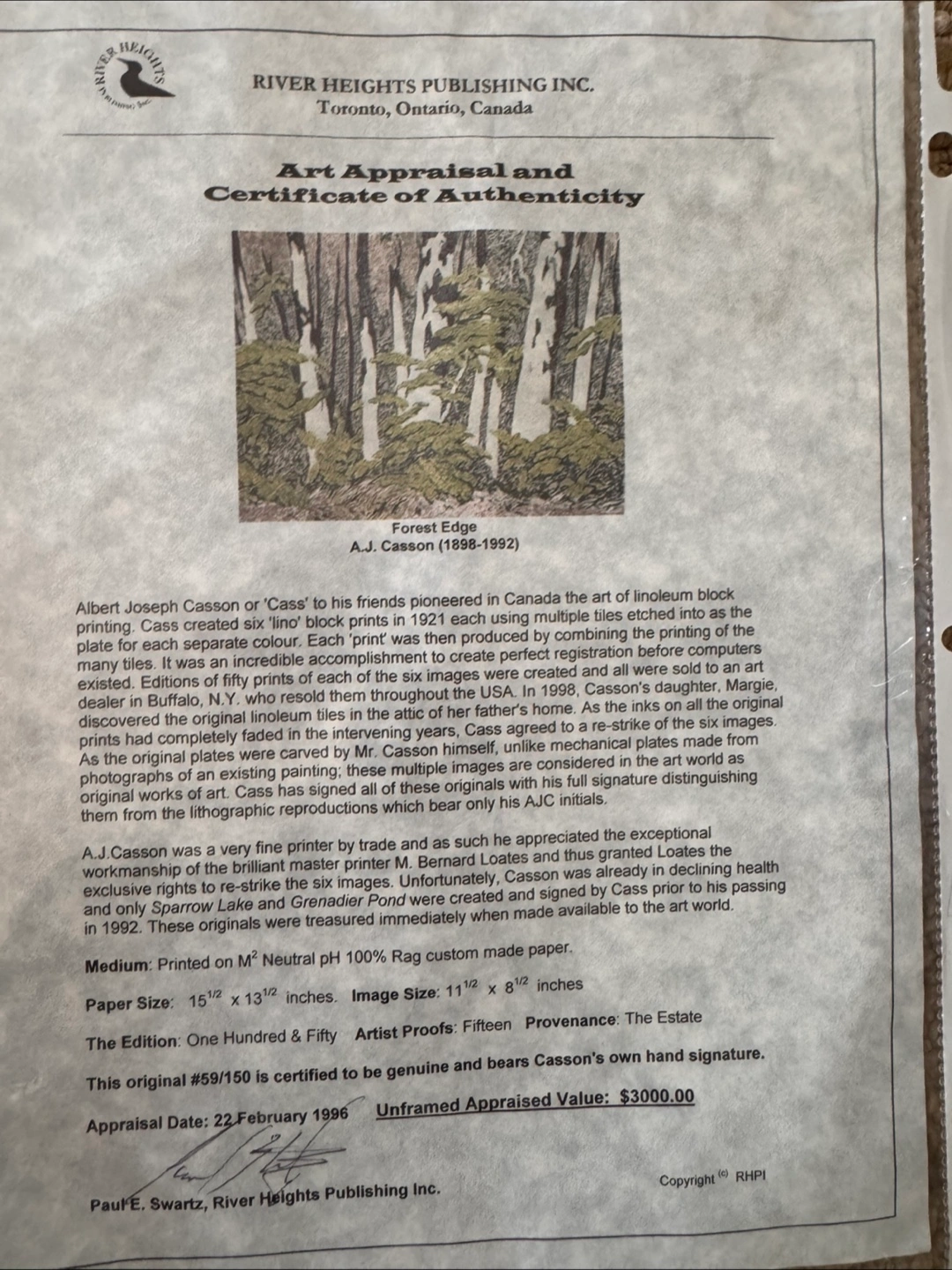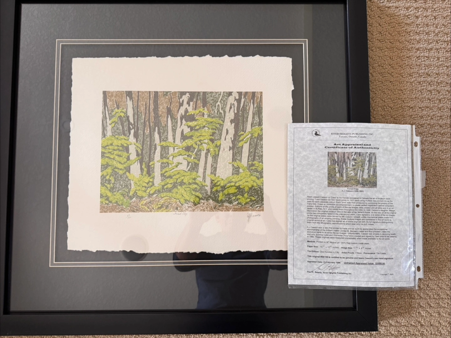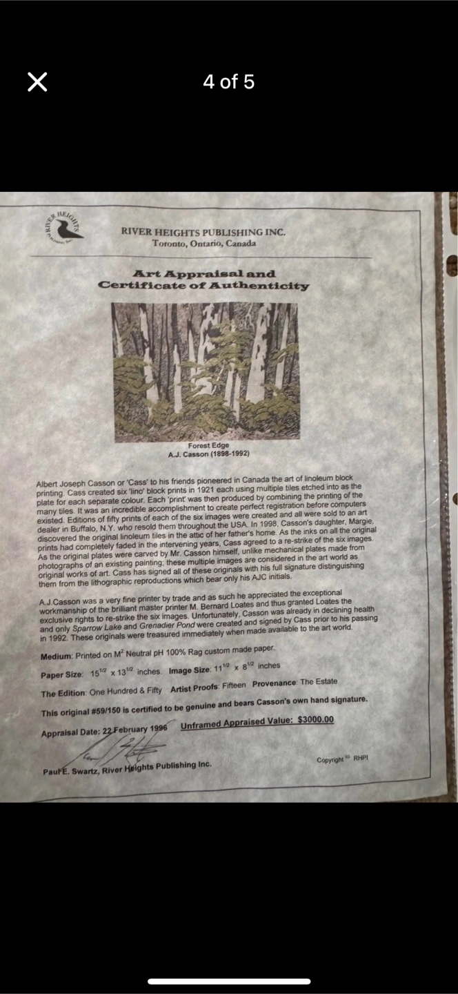 Selling an A.J. Casson painting featuring a serene forest edge scene, this linoleum block print, titled 'Forest Edge' is numbered 69/150 and bears Casson's own hand signature, perfect for art collectors. This piece comes with a certificate of authenticity from River Heights Publishing Inc. and a detailed appraisal document. * Medium: Printed on M\" Neutral PH 100% Rag custom made paper * Paper Size: 15 ½" x 13 ½ inches * Image Size: 11 ½" x 8" inches * Edition: One Hundred & Fifty * Artist Proofs: Fifteen * Provenance: The Estate It's been appraised for $3000 unframed in 1996! Add a touch of Canadian artistry to your space with this unique piece. Please note that while this painting is a pre-loved treasure, its beauty remains timeless. If you're reading this, the painting is still available! I have other prints if interested!