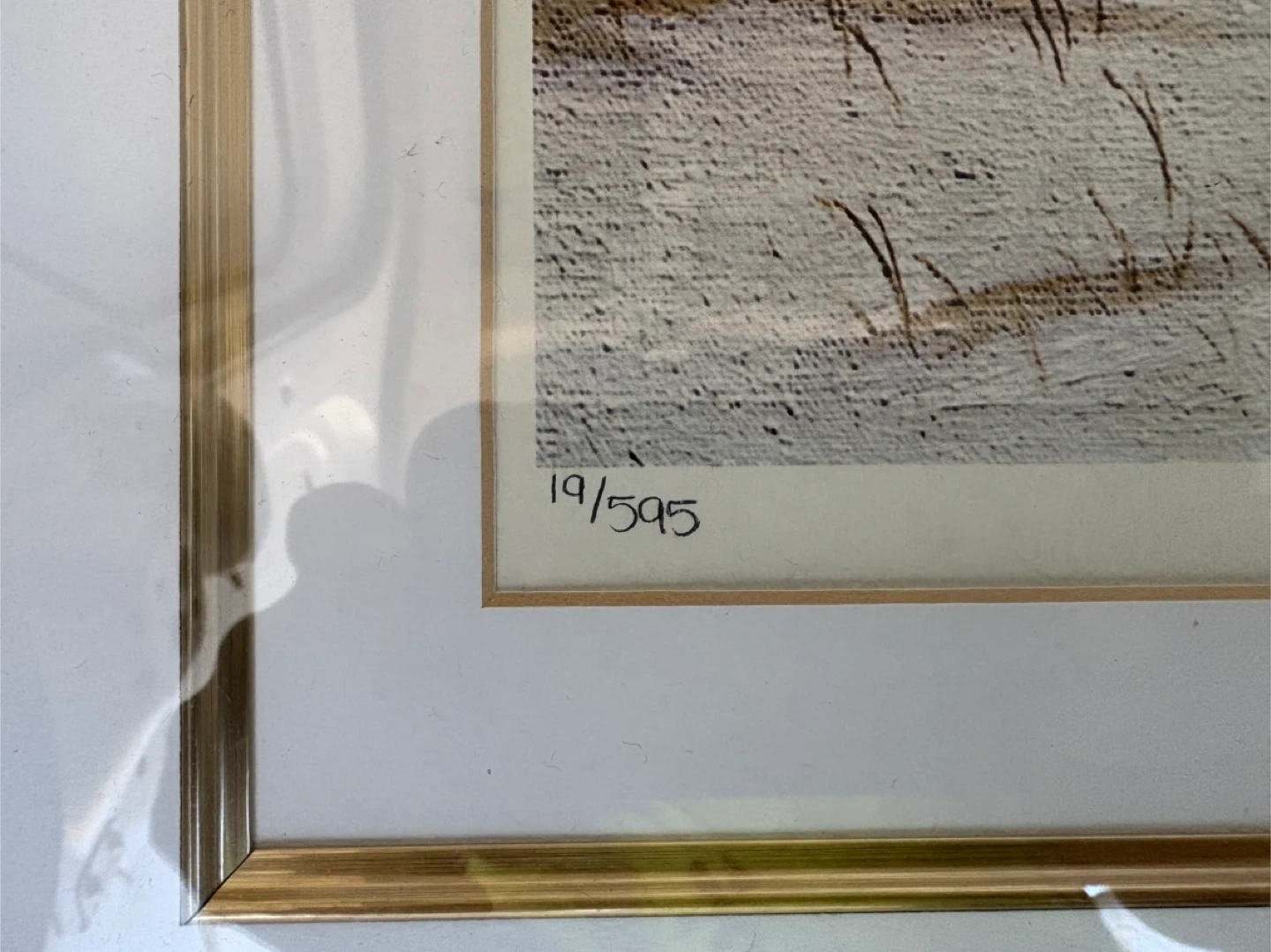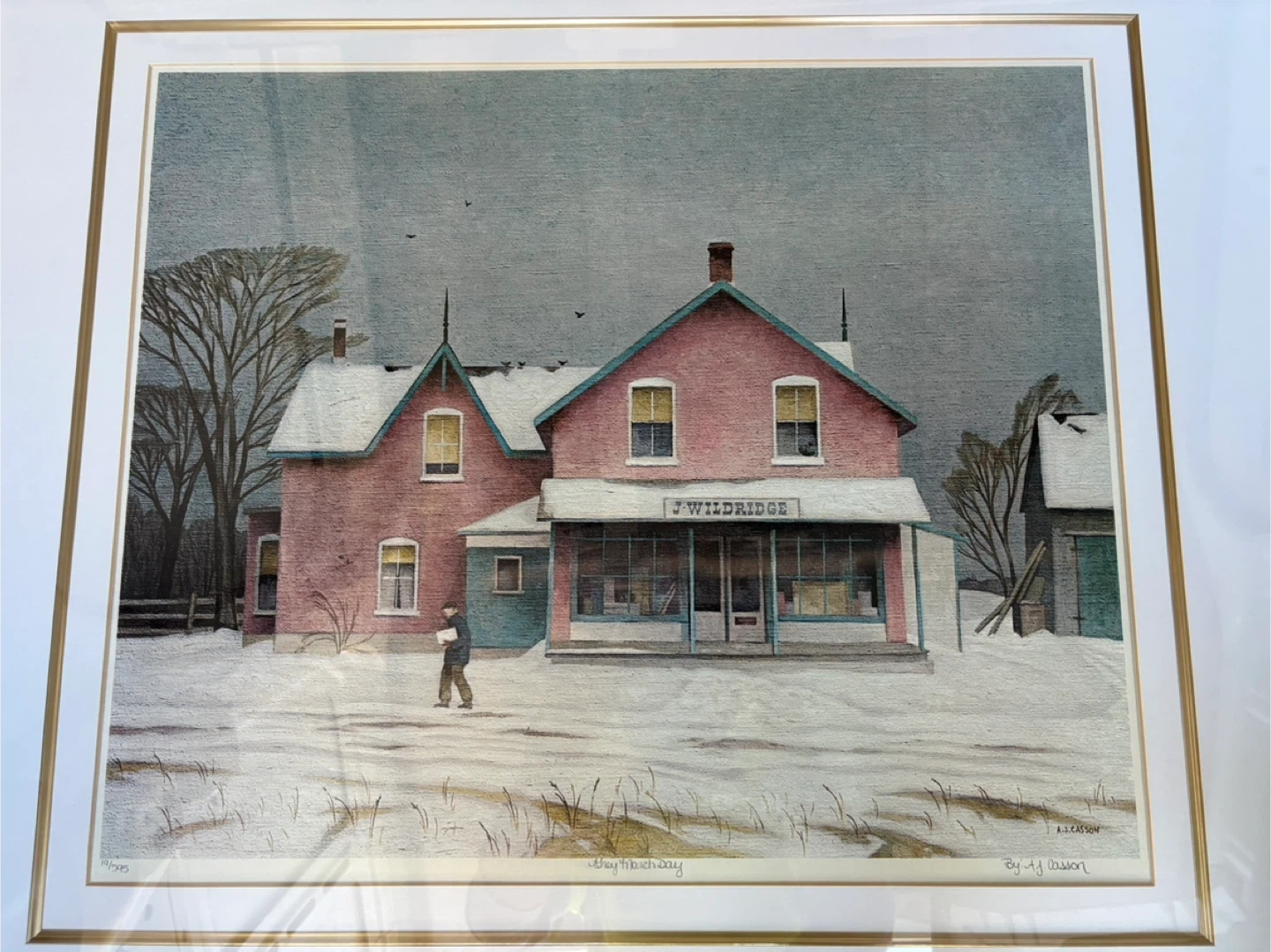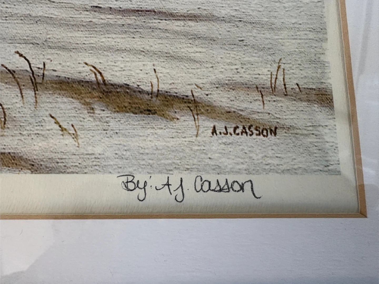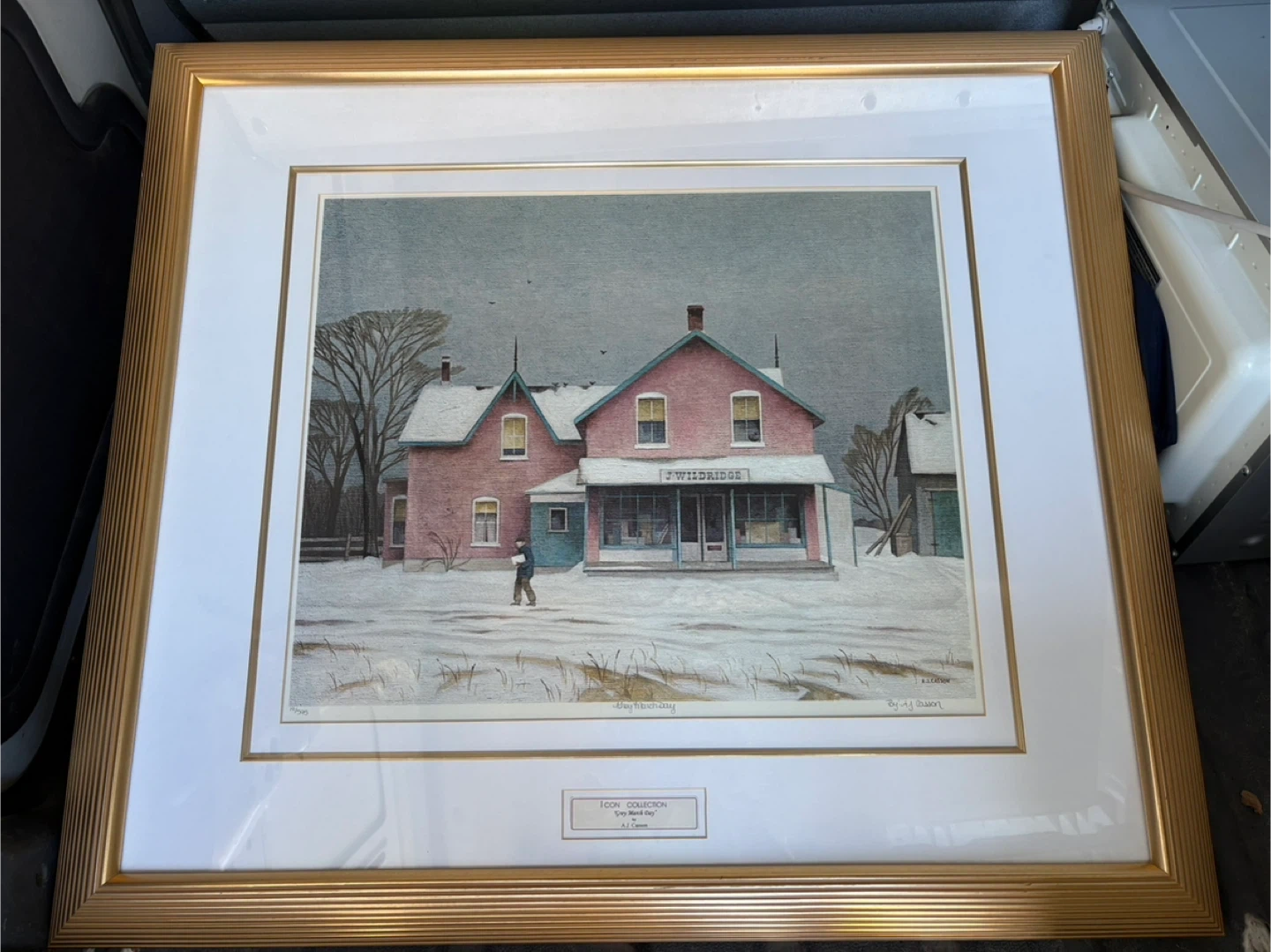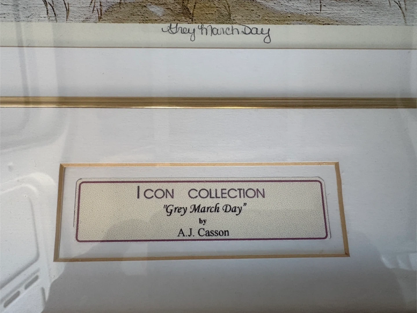 Framed print of A.J. Casson's "Grey March Day" from the Icon Collection. 36”x32”. It's number 19 out of 595 prints. The frame is gold coloured and in great shape EXCEPT for a small dent on the left side. See pictures.
