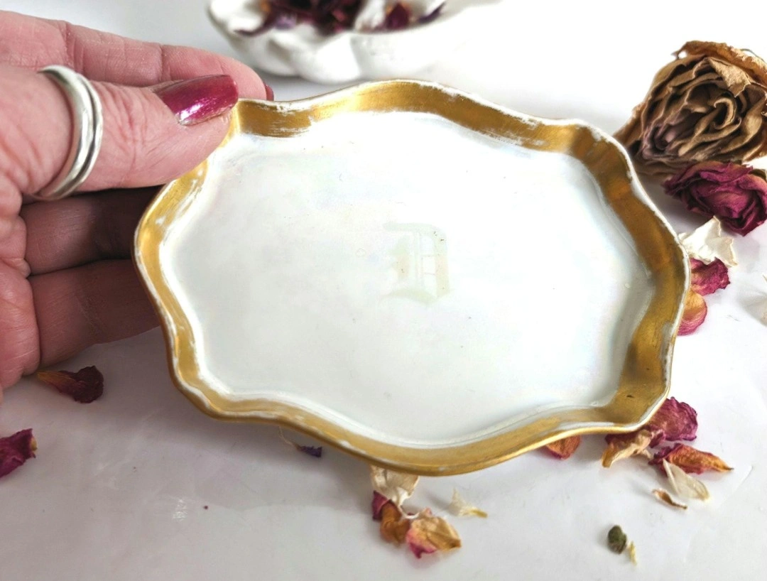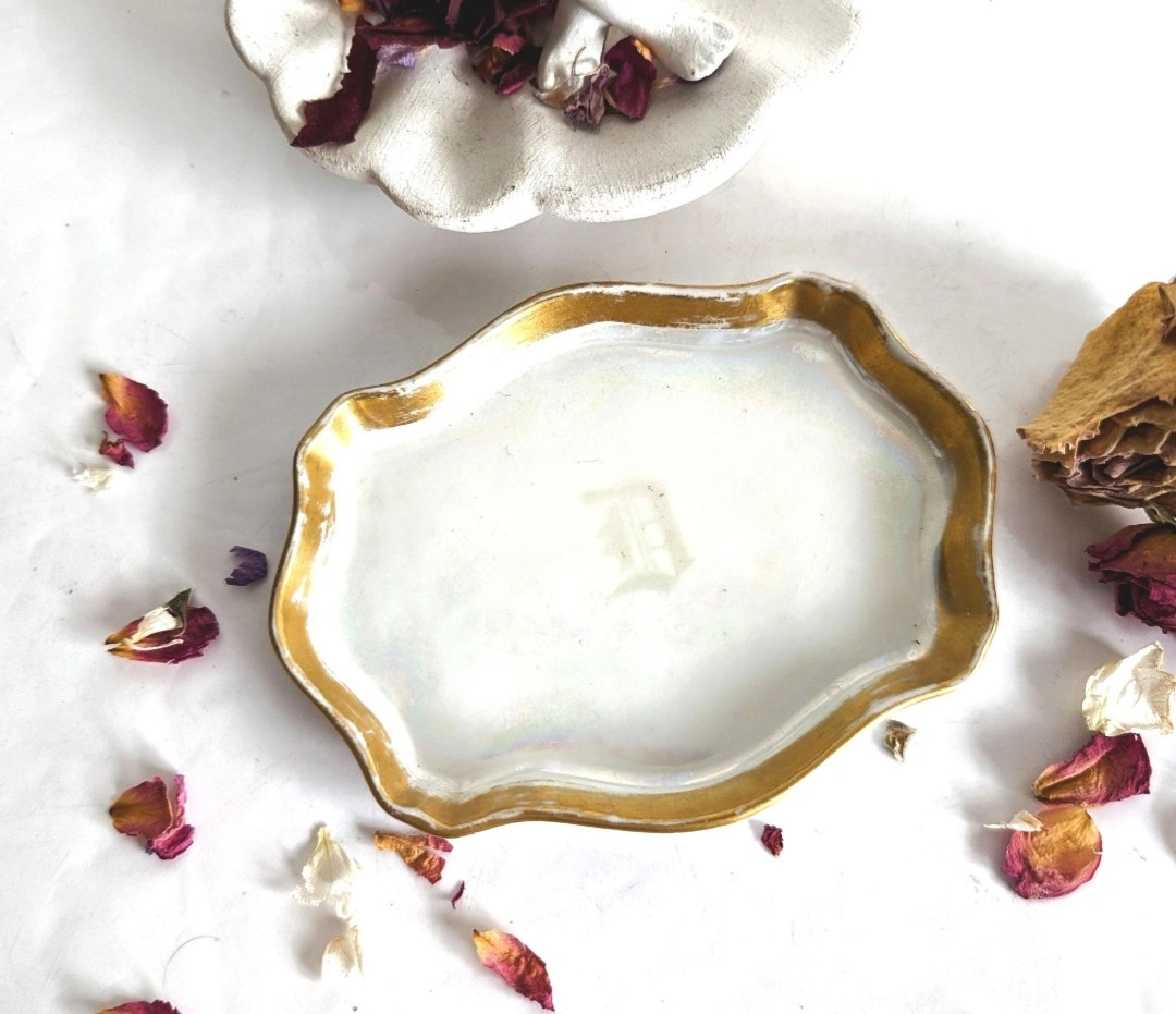 Adorable little ring dish. Stamped A.K. France. Iridescent lustre sheen with gold rim. Faintly monogrammed in calligraphy is the letter 'D'. Measures approximately 4.5 inches x 3.5 inches in diameter. Good vintage condition. Wear to the gold rim as shown. Wonder vintage charm. π PICK UP TOWNLINE HWY 2 AREA π CASH is preferred please π Thanks for looking π©΅