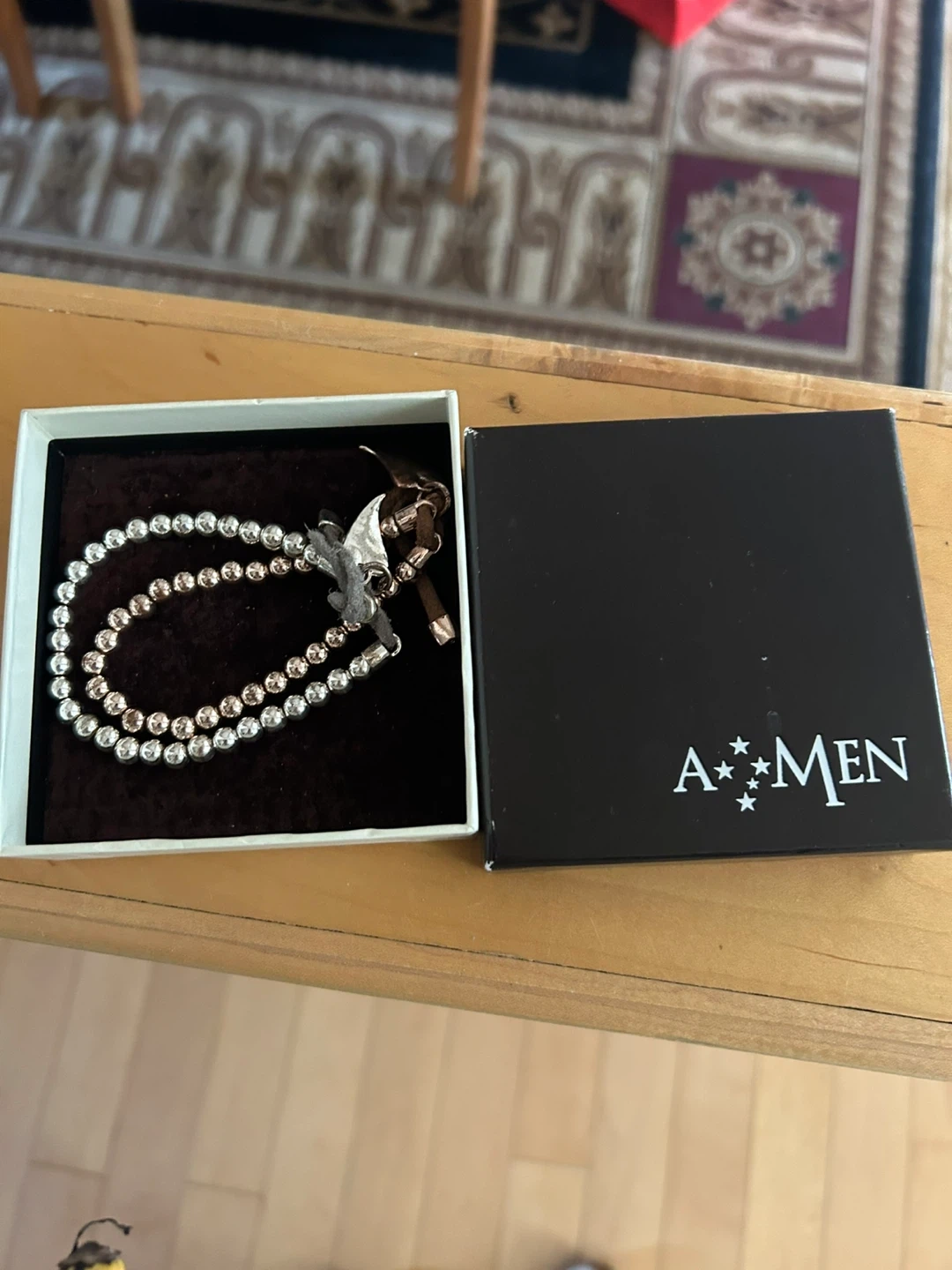26Selling a beautiful A-MEN bracelet featuring silver and rose gold beads. It comes in its original box, making it perfect for gifting or keeping it safe when not in use! The bracelet is in great condition and ready to be worn and enjoyed
