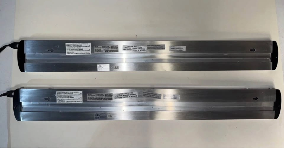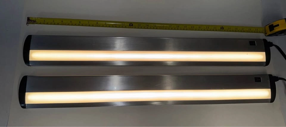 10Selling a pair of used LED bar lights, 29 inches long, in excellent working condition. Each light features a sleek brushed metal housing and warm white illumination, ideal for under-cabinet, studio, or workspace lighting. Both units include built-in power switches and provide bright, even lighting with low energy use.
