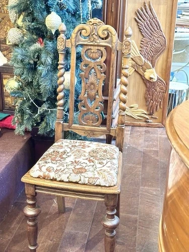 60A pair of Tudor Revival style carved wooden armchair with a floral upholstered seat. Moving Sale — We’re moving and letting go of our beautiful mid-century & Nordic design pieces — sofas, tables, shelves, and more. Condition: Vintage and in good shape, with some signs of age and use. Please review the photos carefully for details. Asking $320 CAD for 2 or $160 CAD for 1. Richmond