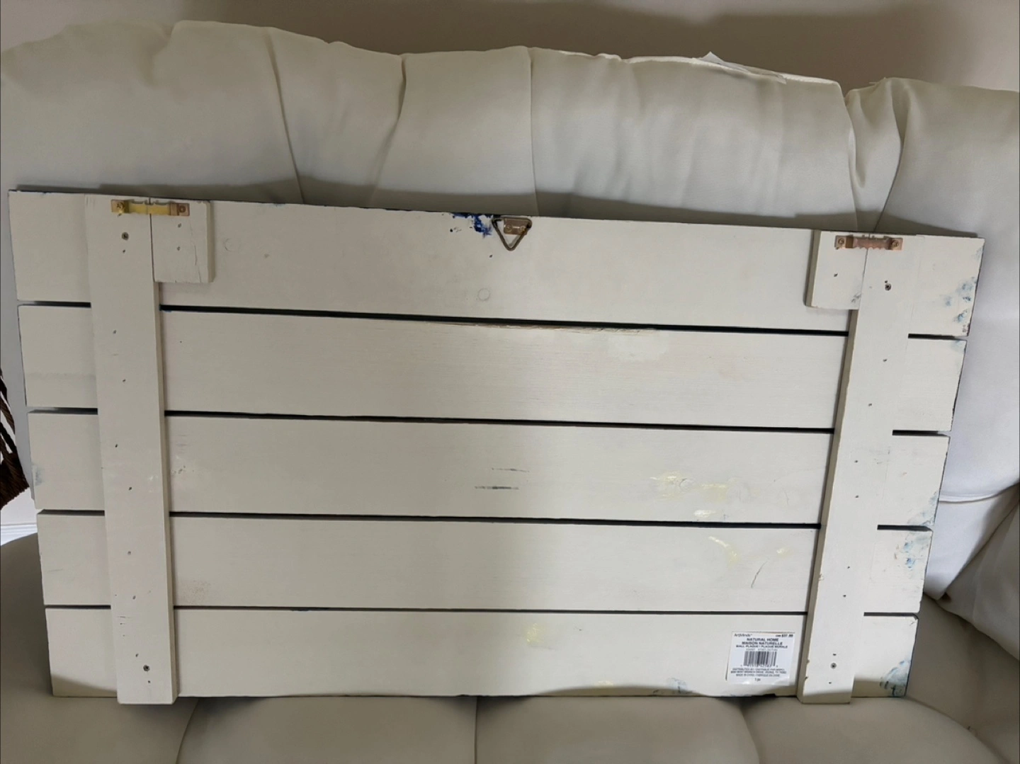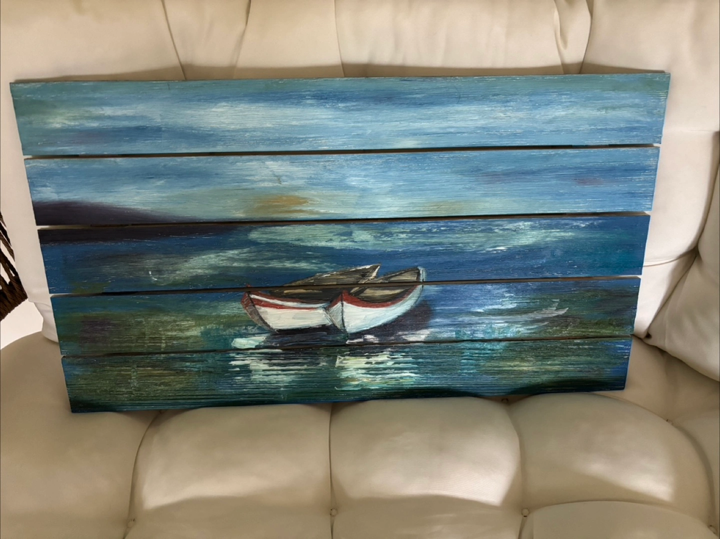 Here's a lovely wooden painting featuring a boat scene! It's a unique piece of wall art that would add a touch of nautical charm to any room. Oil on wood by a self-taught artist. 26”x14.5”Meet-up in Royal Oak NW Calgary.