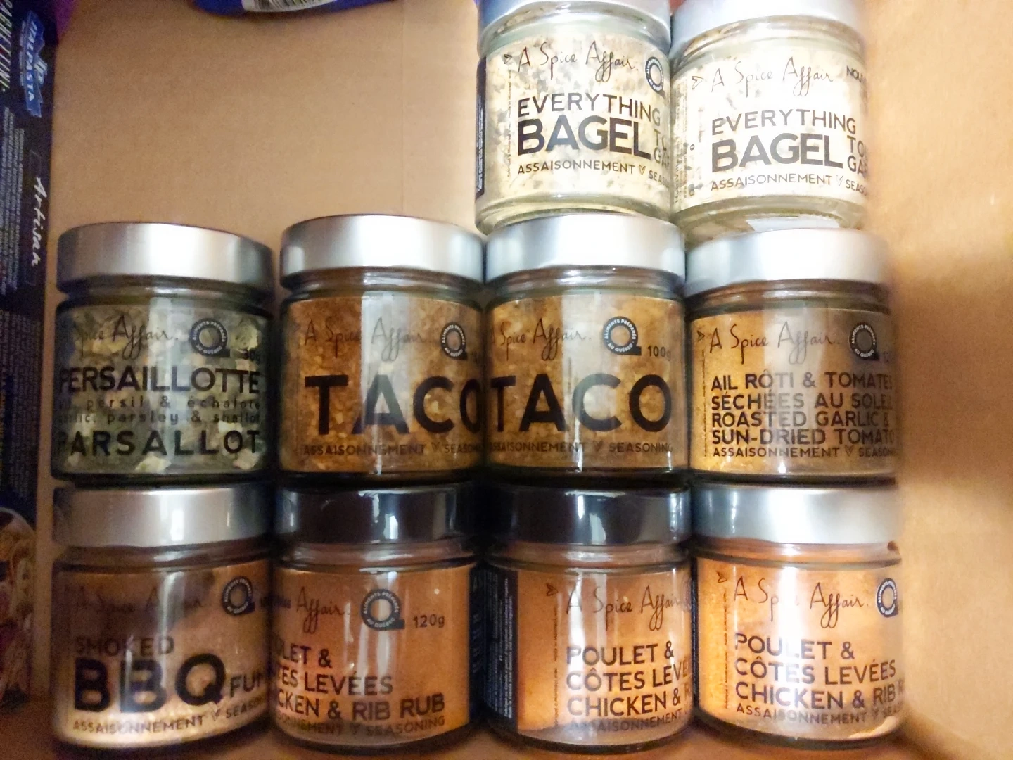 15New plastic sealed jars. $6 per jar. typically $10 to $12. A variety of A Spice Affair seasonings to spice up your cooking! You'll find blends like Taco Taco, Everything Bagel, Persaillotte, Smoked BBQ, and more! Perfect for adding a burst of flavour to any dish