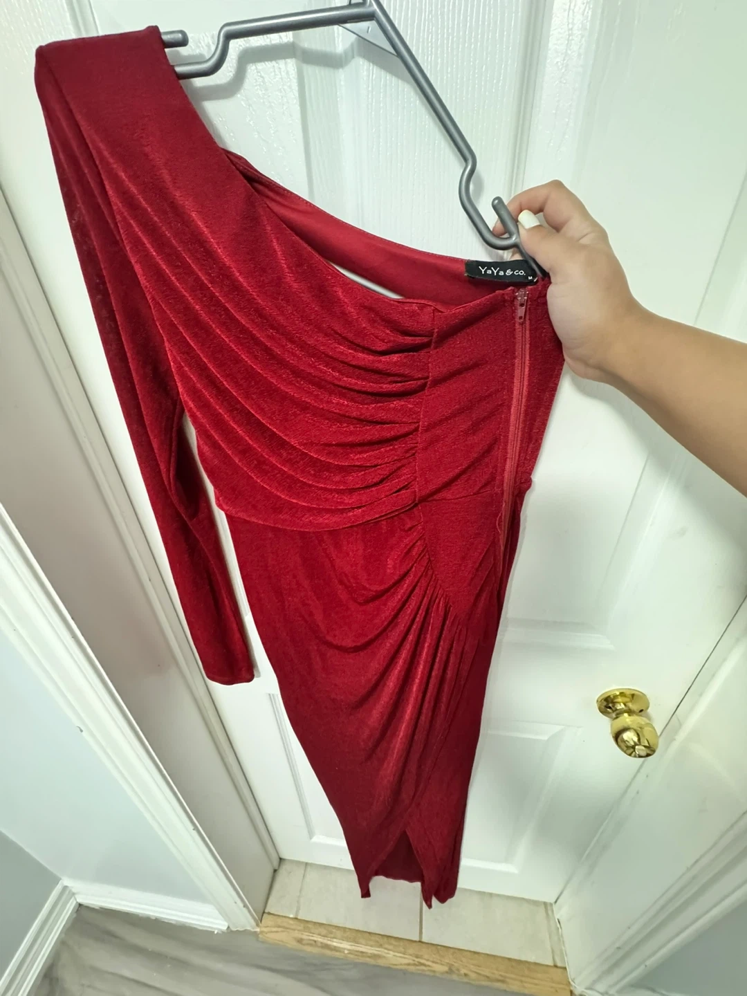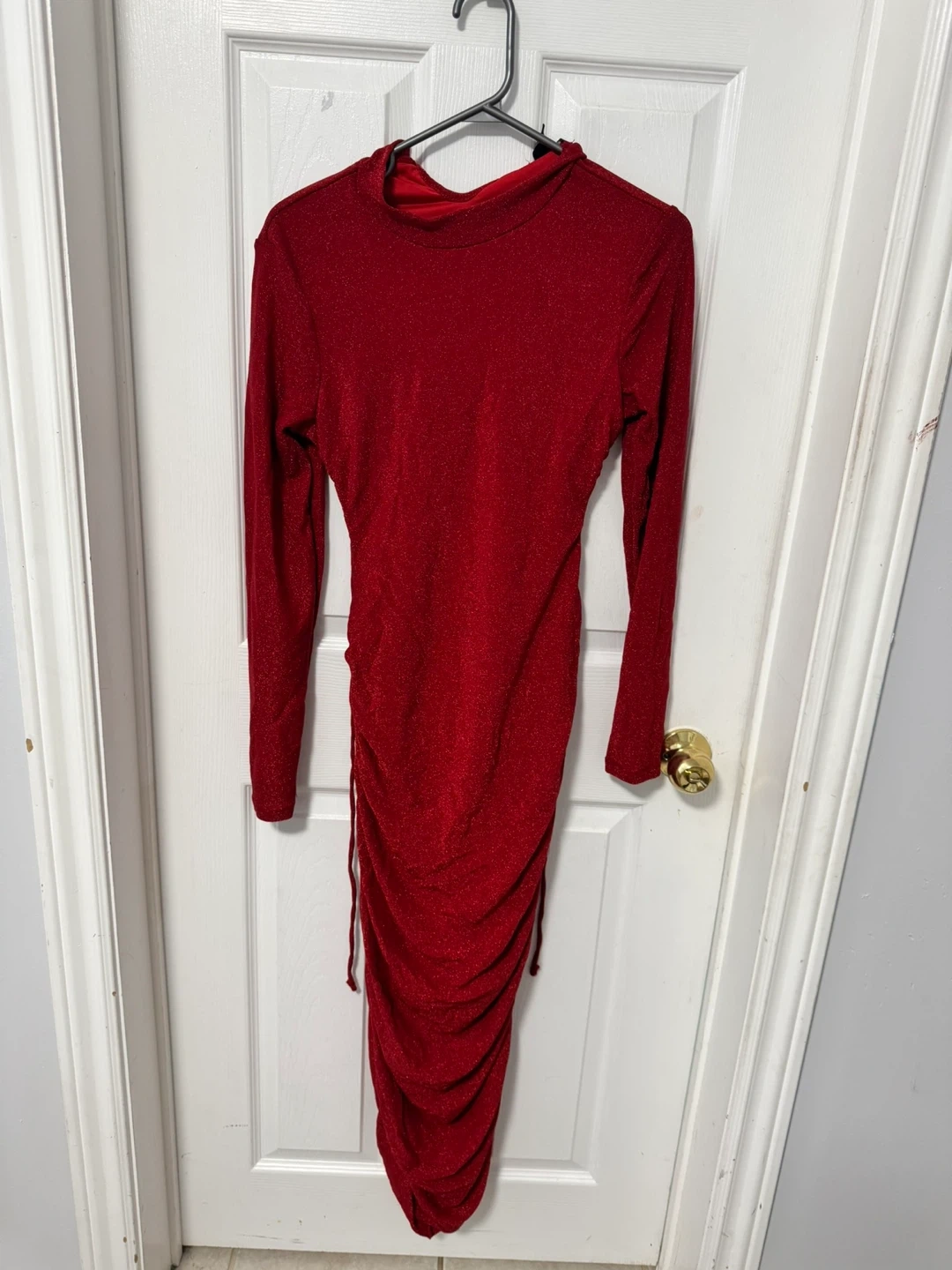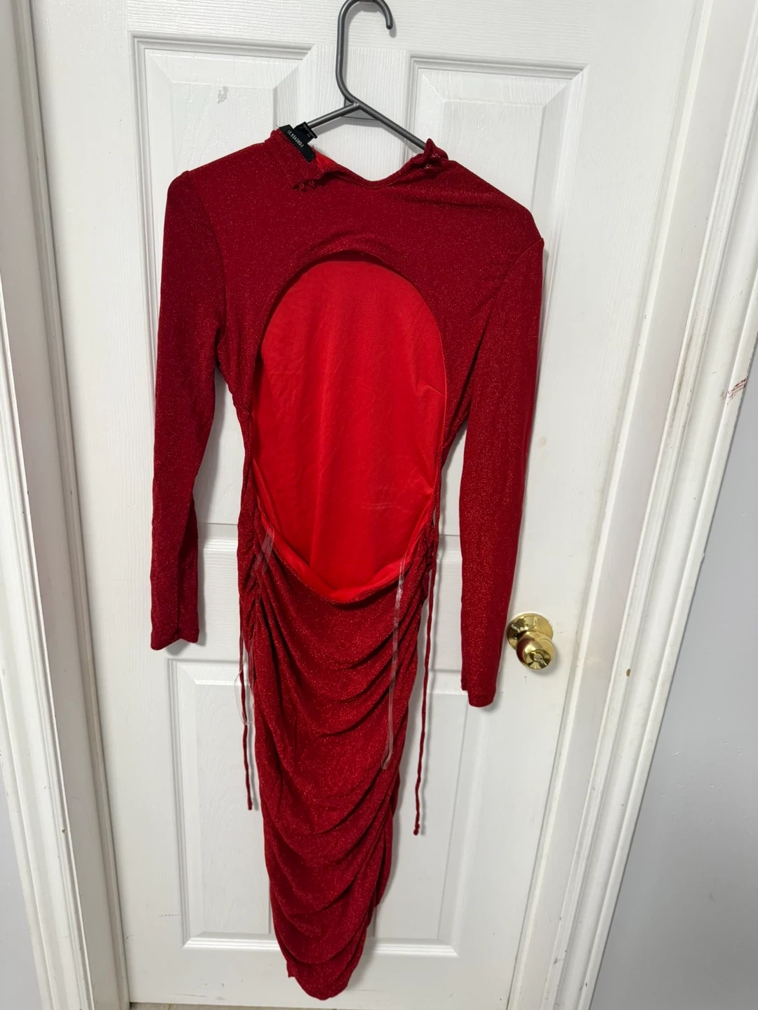 A stunning Yaya & Co. red ruched dress with a sparkle finish. It has a unique cutout back and adjustable side ties for a custom fit. This dress is perfect for a night out or a special occasion!