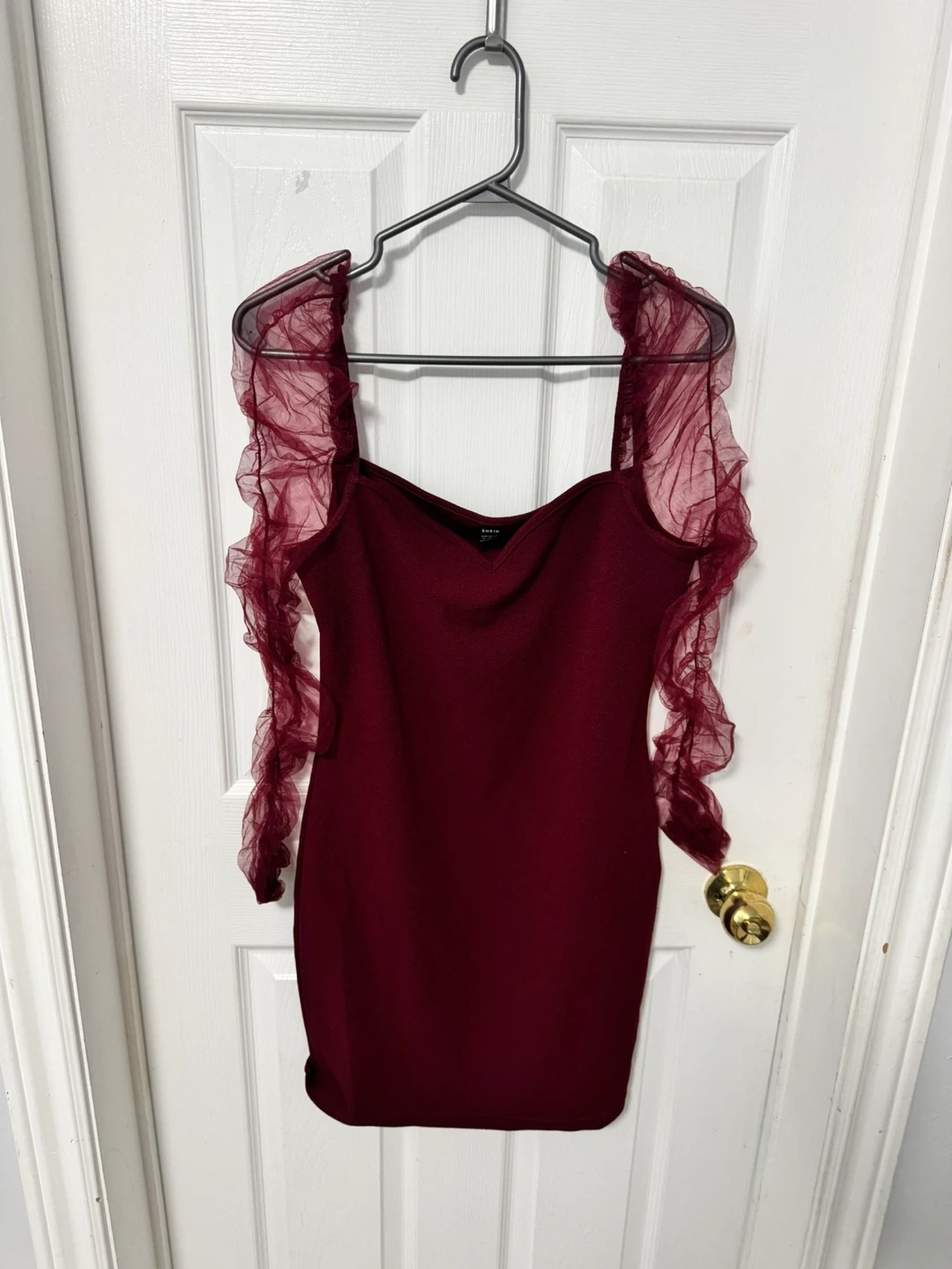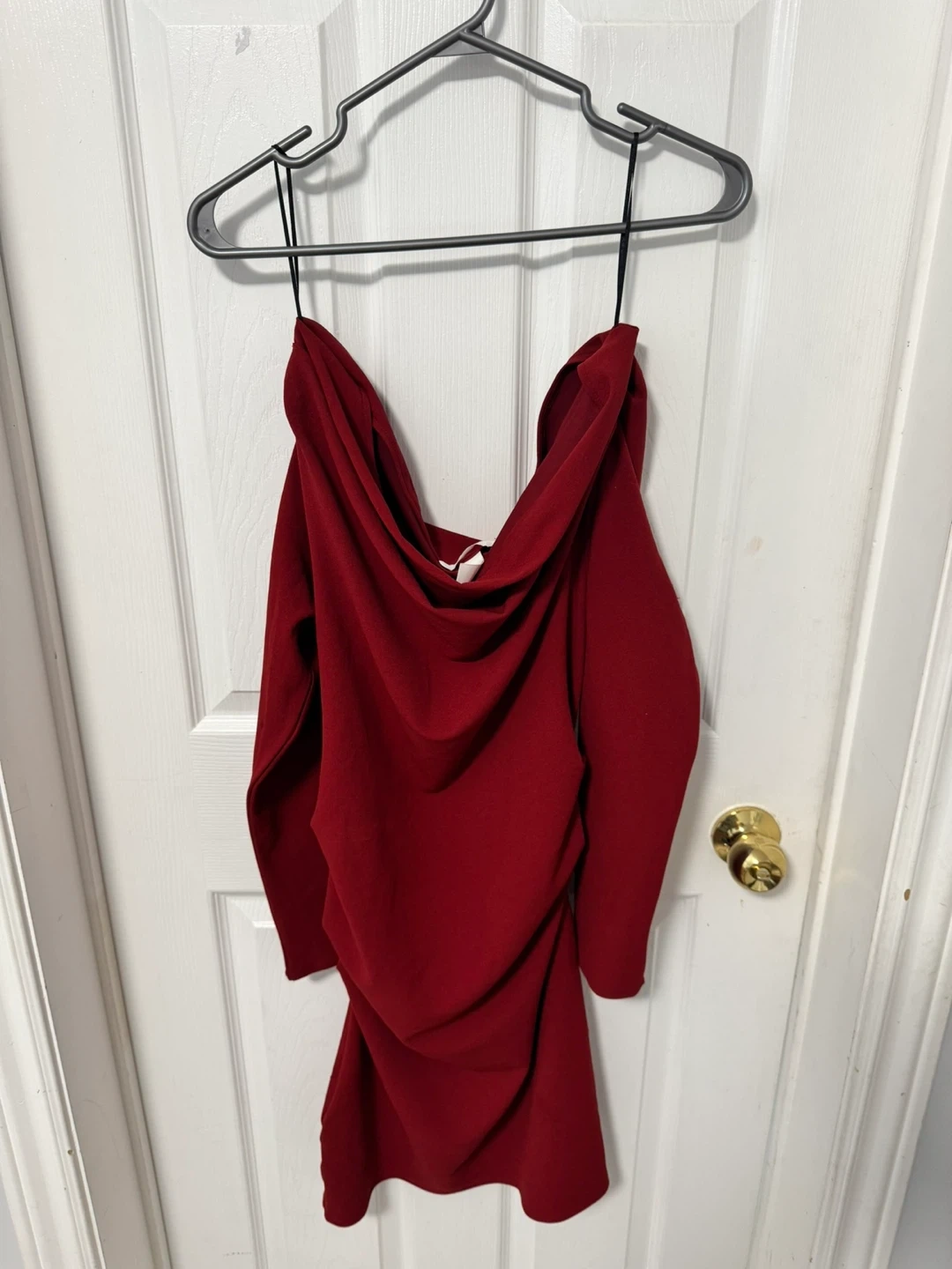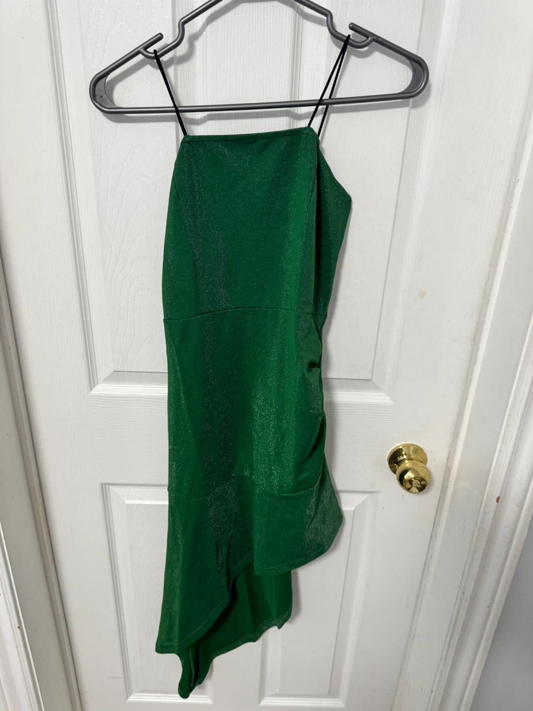 A stunning Yaya & Co. red ruched dress with a sparkle finish. It has a unique cutout back and adjustable side ties for a custom fit. This dress is perfect for a night out or a special occasion!
