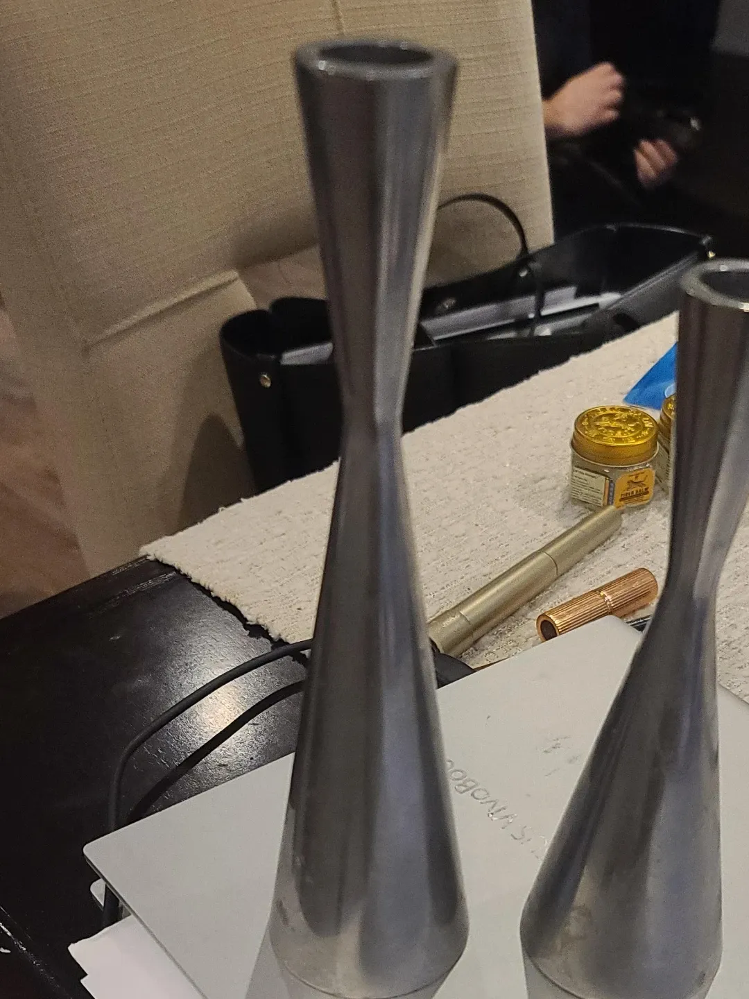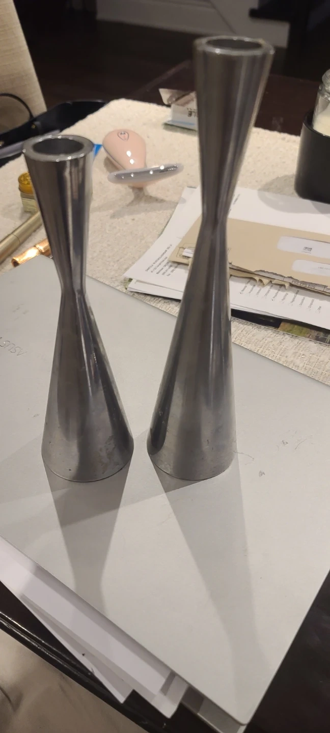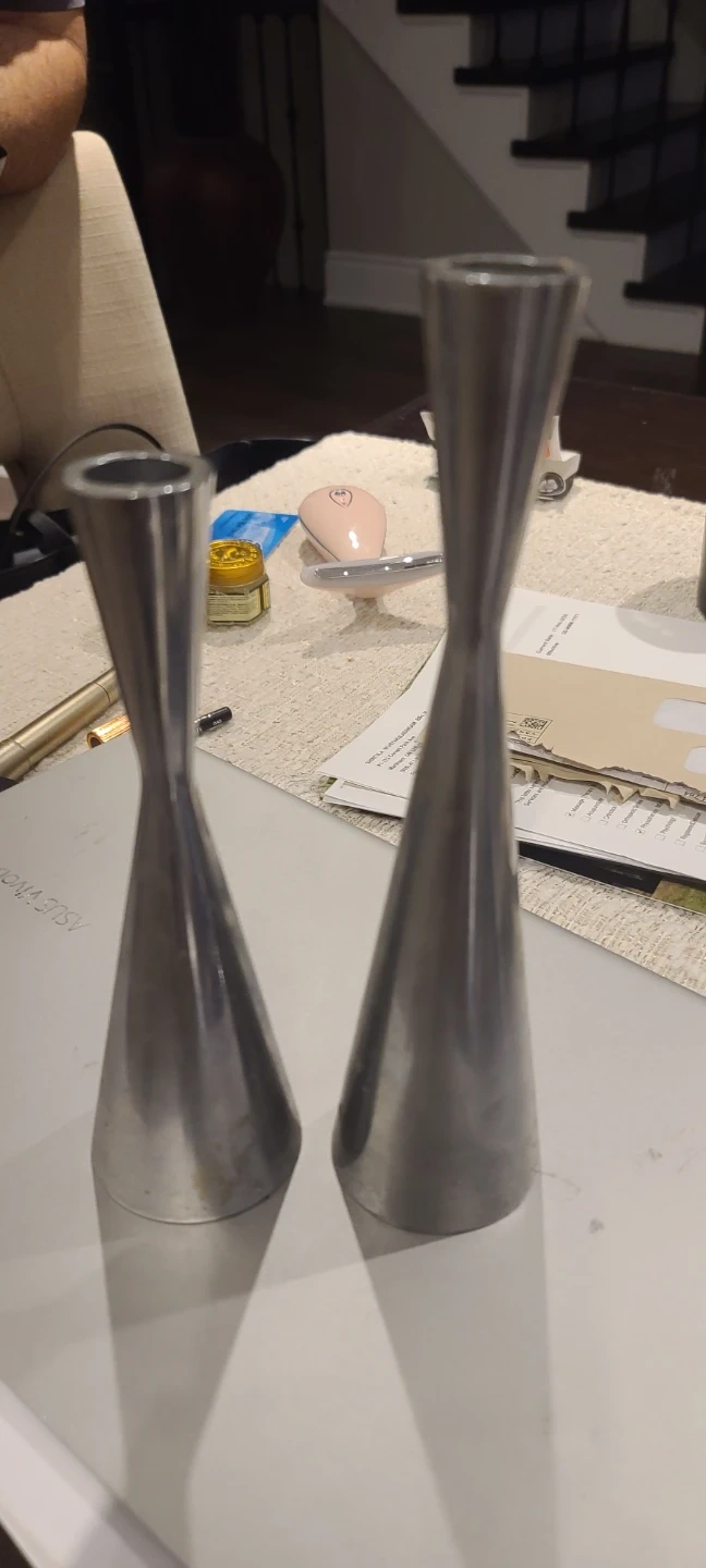 Set of two elegant, tall candlesticks. These are made from a brushed metal material and have a sleek, modern design. They're perfect for adding a touch of sophistication to any tabletop or mantel. The opening at the top fits standard taper candles. 1 is 9 inches 1 is 71/2 inches