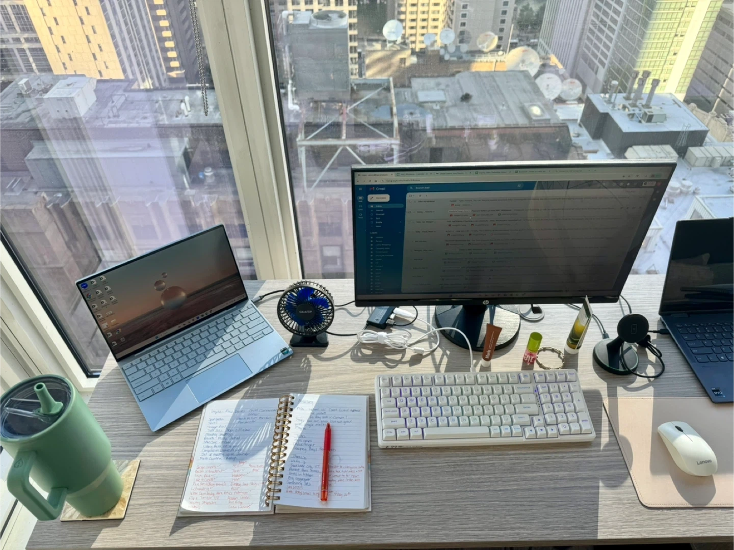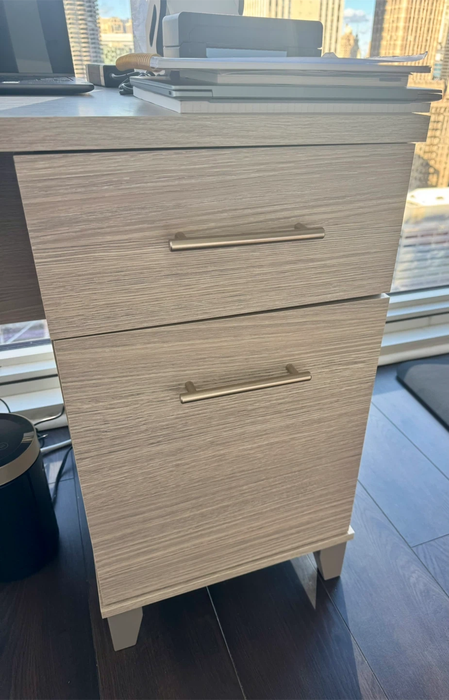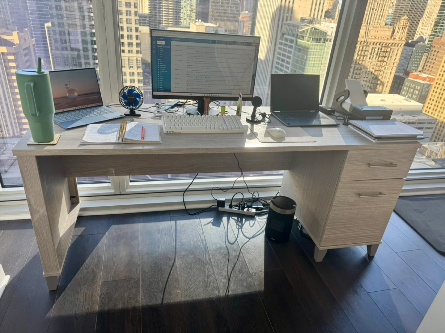 Essentially brand new. I purchased last year but I need a smaller desk as I move to my new apartment. This is a heavy duty large desk. Great for 2 monitors and your laptop. Dimensions shown in pictures.