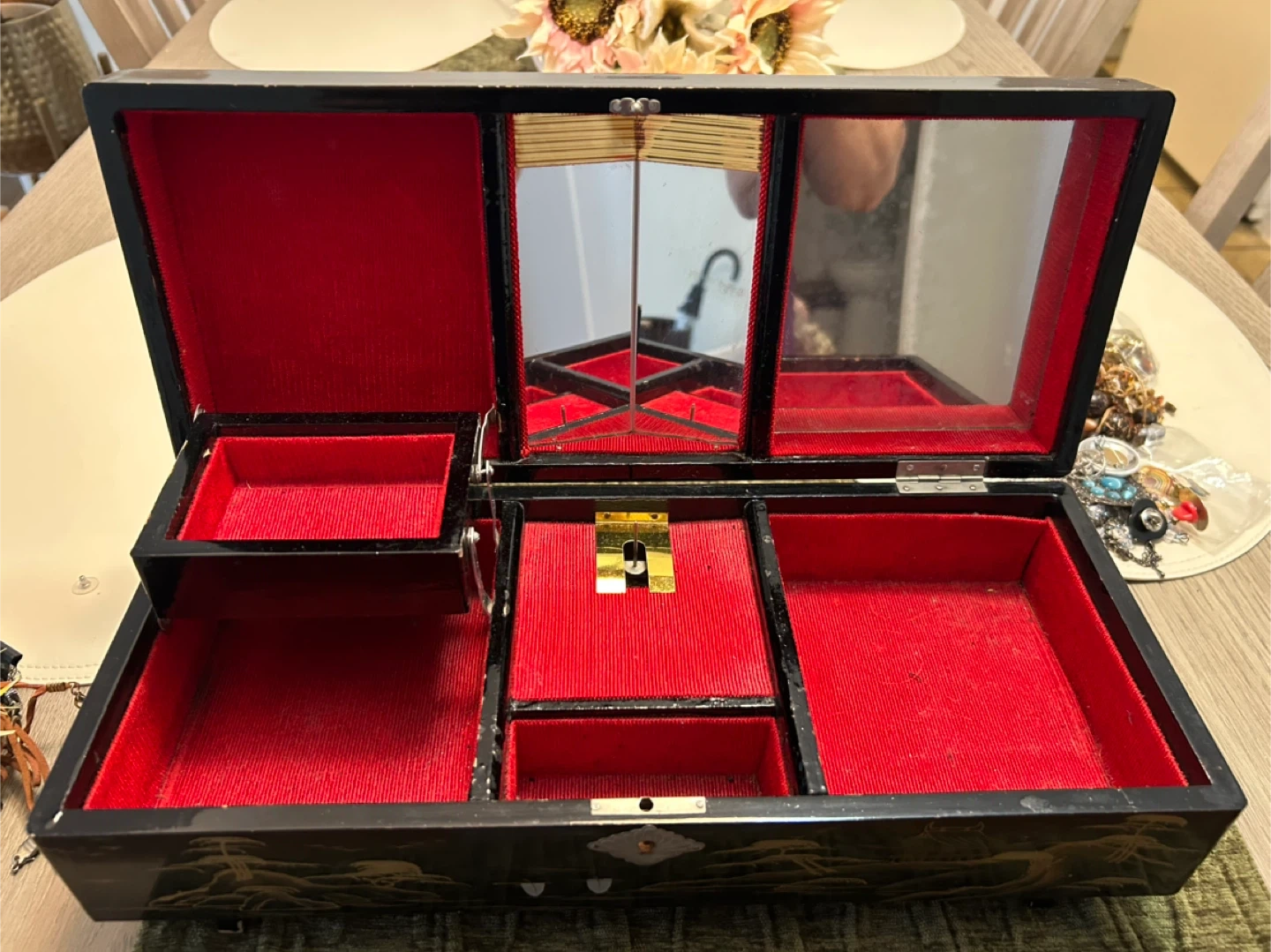 Here's a beautiful vintage jewelry box! It's lacquered and features lovely oriental-style artwork on the exterior. The inside is lined with red velvet and has several compartments for organizing your jewelry. It's in great condition and would make a wonderful addition to any collection