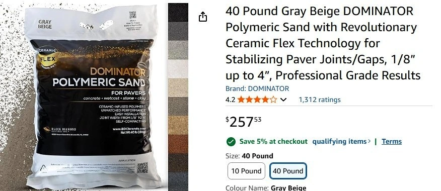 40 Lb bag of Gray/beige Dominator Polymeric Sand ceramic flex sand sealed. Asking $150.00. Retail on Amazon for $257. Check out our other listings!