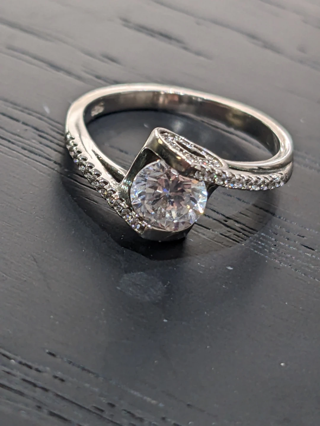 Beautiful sterling silver and cubic zirconia ring with a modern twist band (bypass). Set with a round brilliant cut centre stone and smaller accent stones along the band. Stamped 925, size 6. In excellent condition.