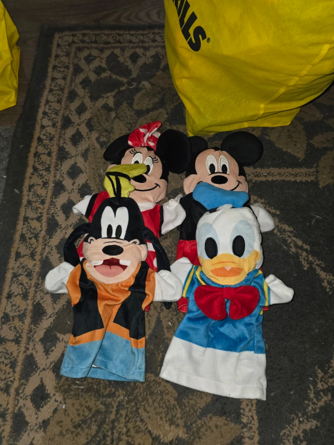 Set of four Disney hand puppets. Includes Mickey Mouse, Minnie Mouse, Donald Duck, and Goofy. Soft plush material. Great for storytelling and imaginative play!