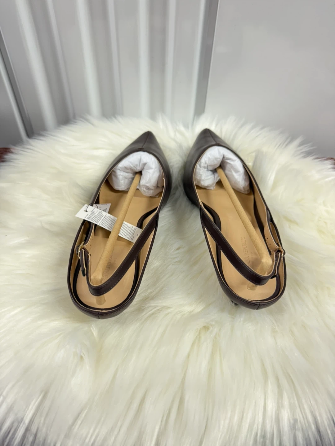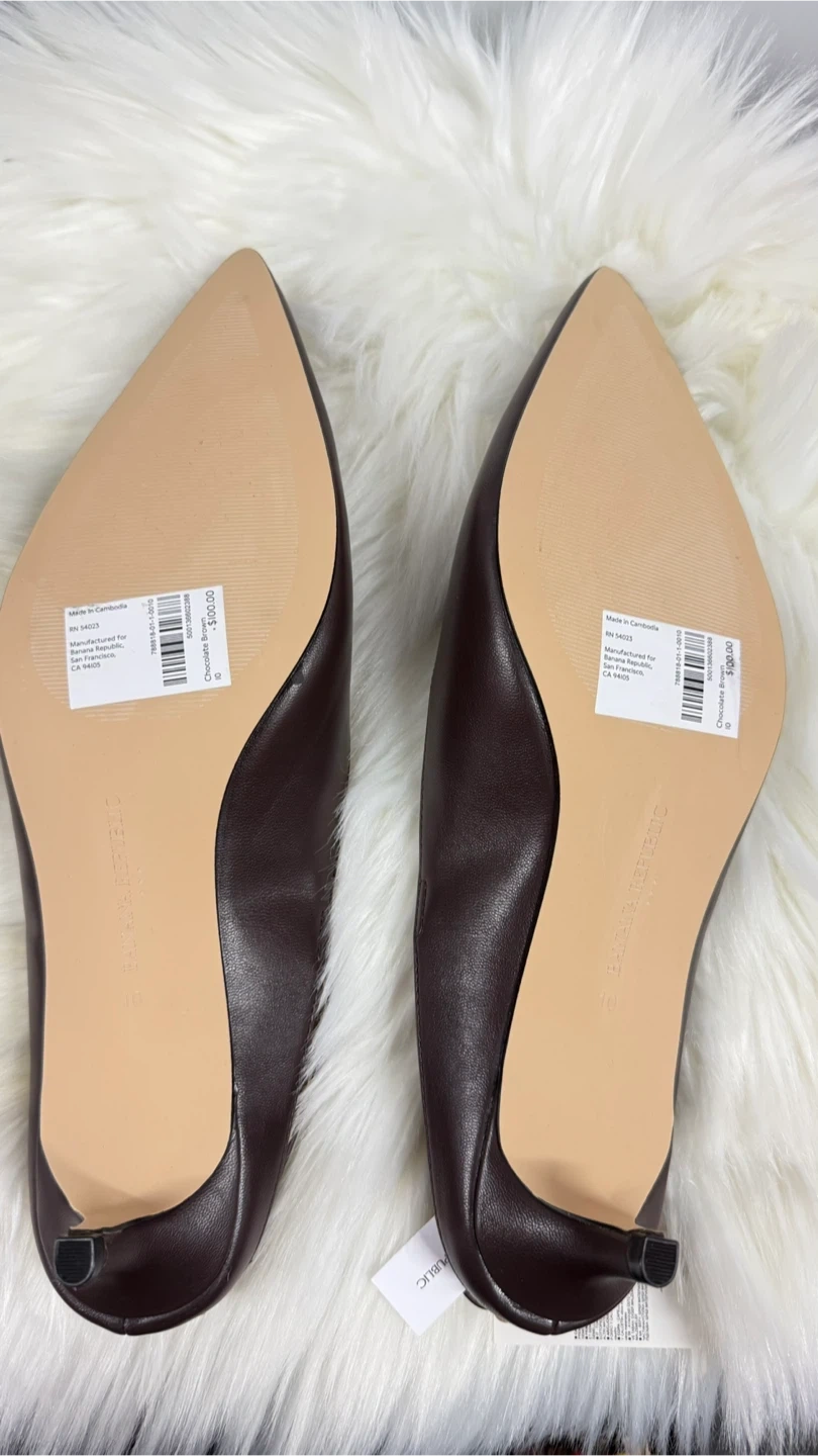 These Banana Republic kitten heel slingbacks are made from vegan leather in a chocolate brown color. They're a size 10 and come with their original box. Perfect for dressing up an outfit!