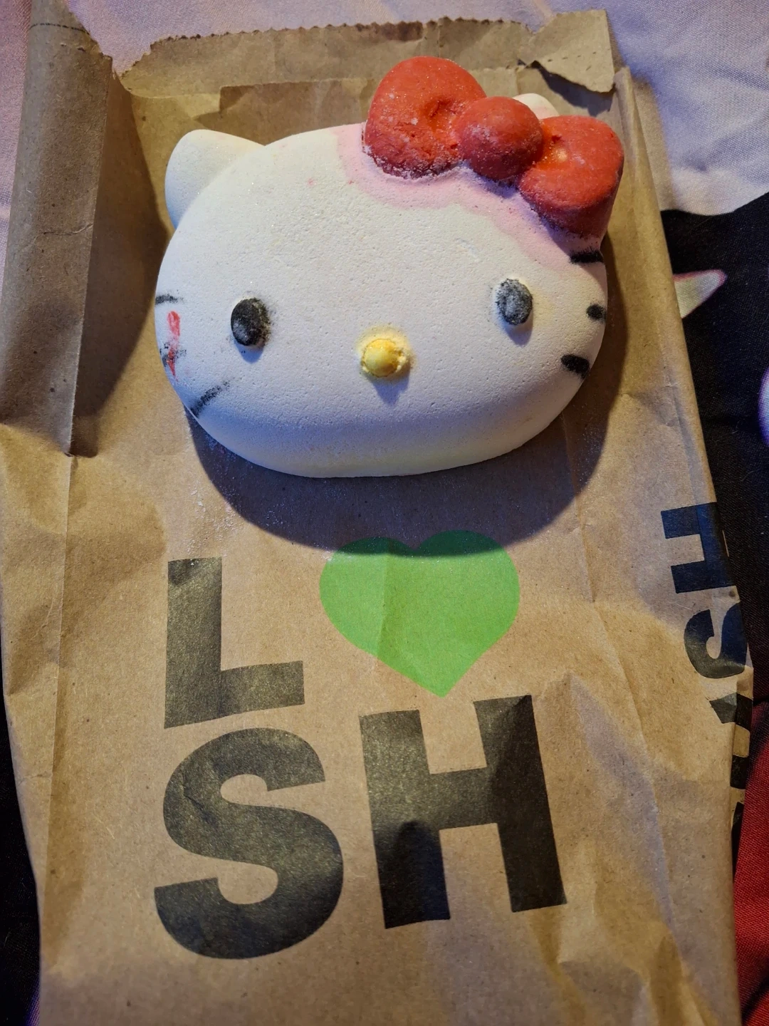 This is a LUSH Hello Kitty bath bomb. It's designed to fizz and dissolve in your bath. Get ready for a fun and fragrant soak!