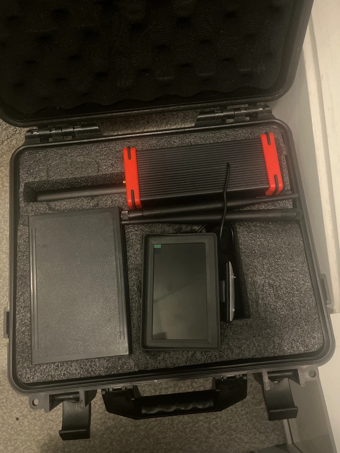 This is a complete wireless video transmitter and receiver system. It includes a portable monitor and two antennas. The unit comes in a protective hardshell case. This system is useful for remote monitoring applications.
