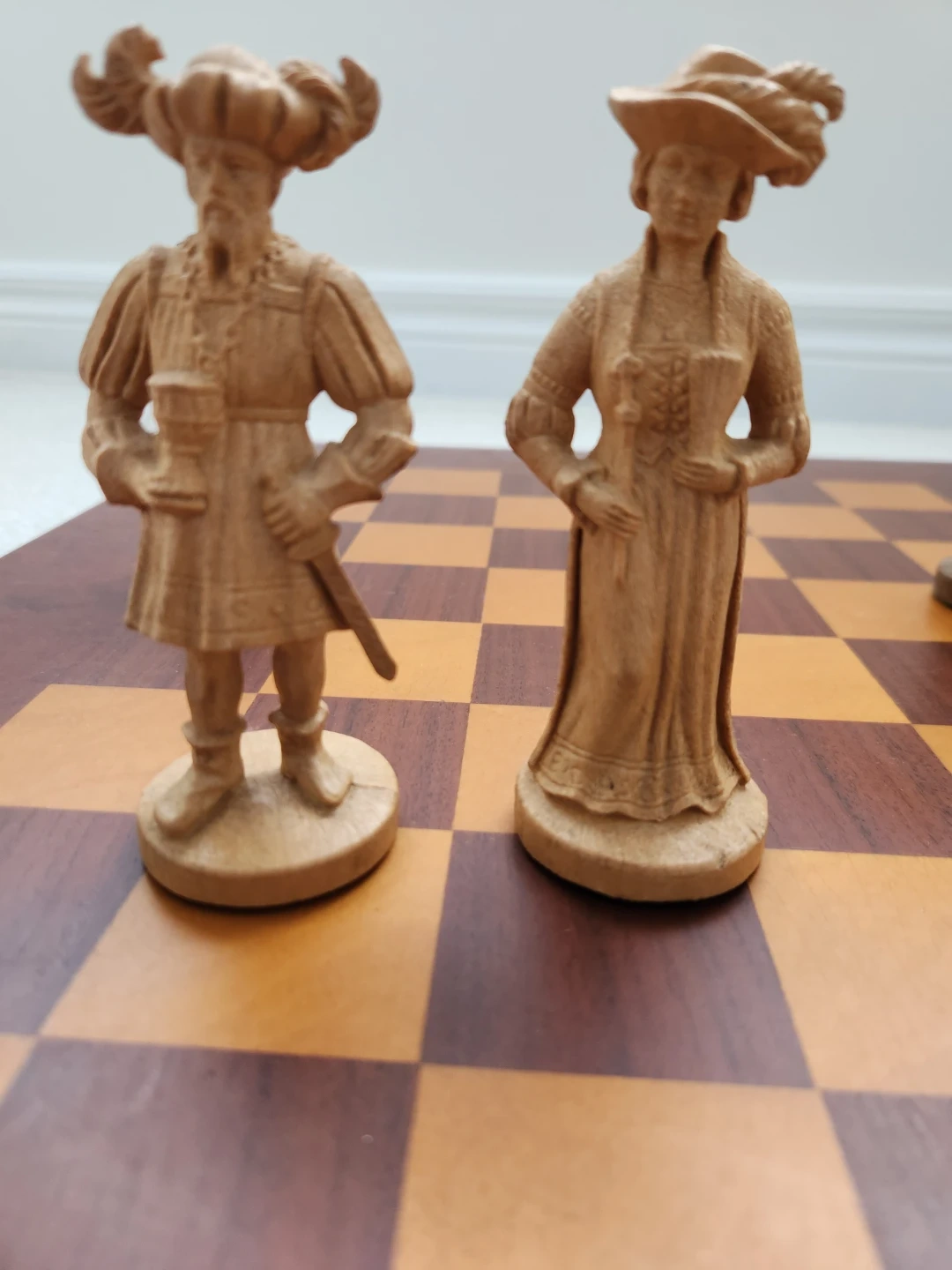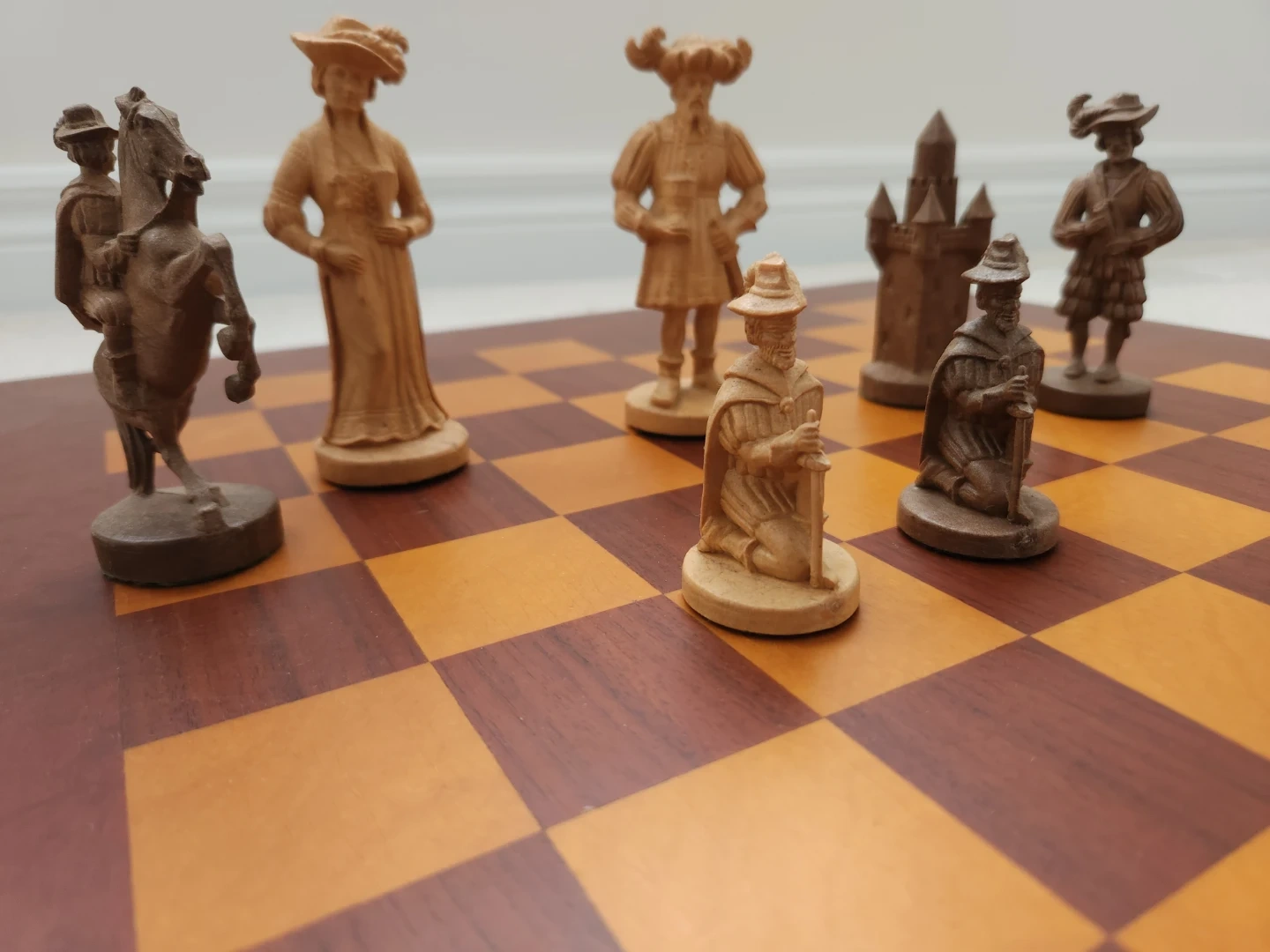 This is a complete set of chess pieces featuring detailed figures. It's a classic design that would look great on any chessboard. These pieces are well-crafted for strategic play. The king is 12 cm tall.