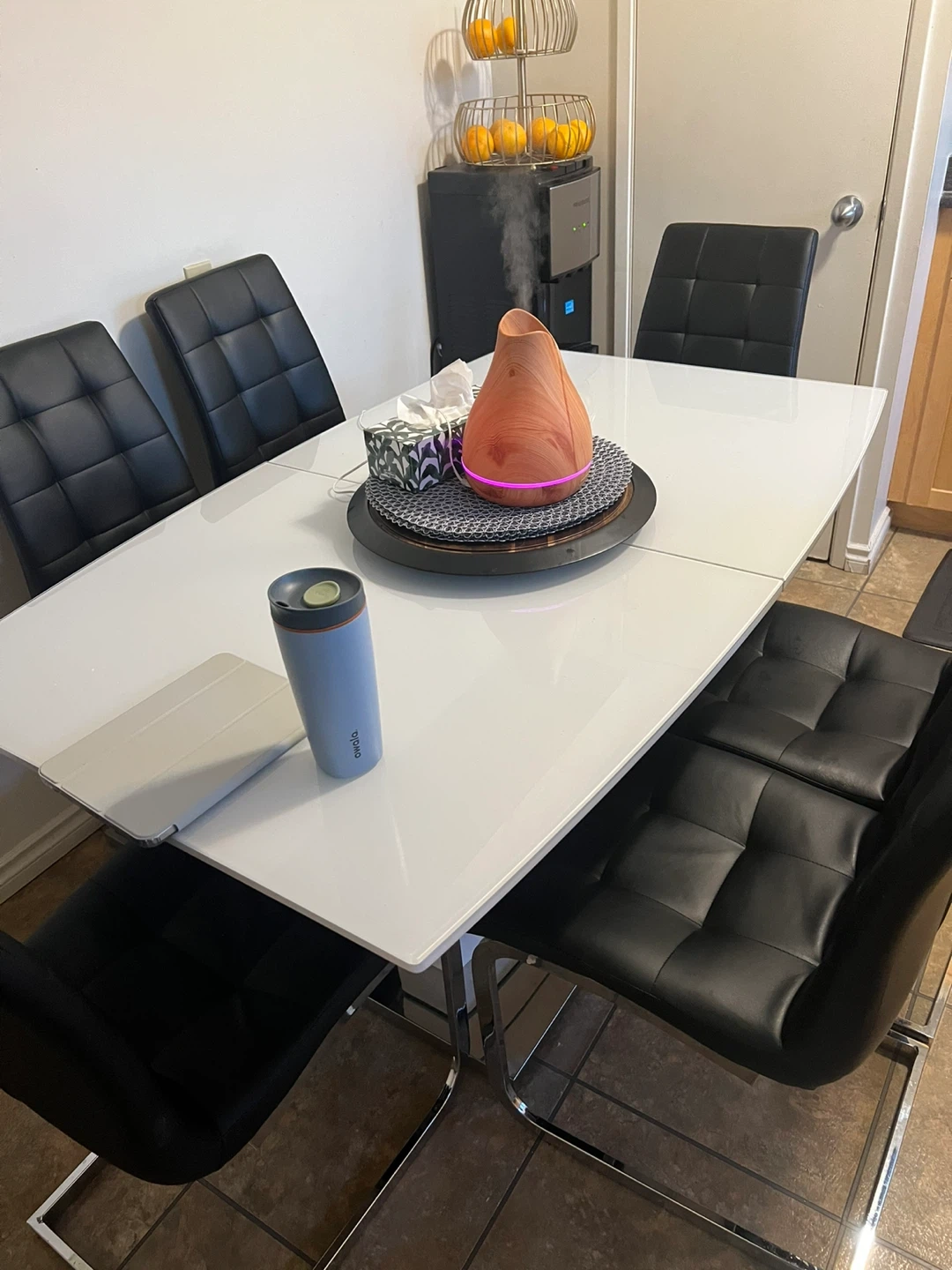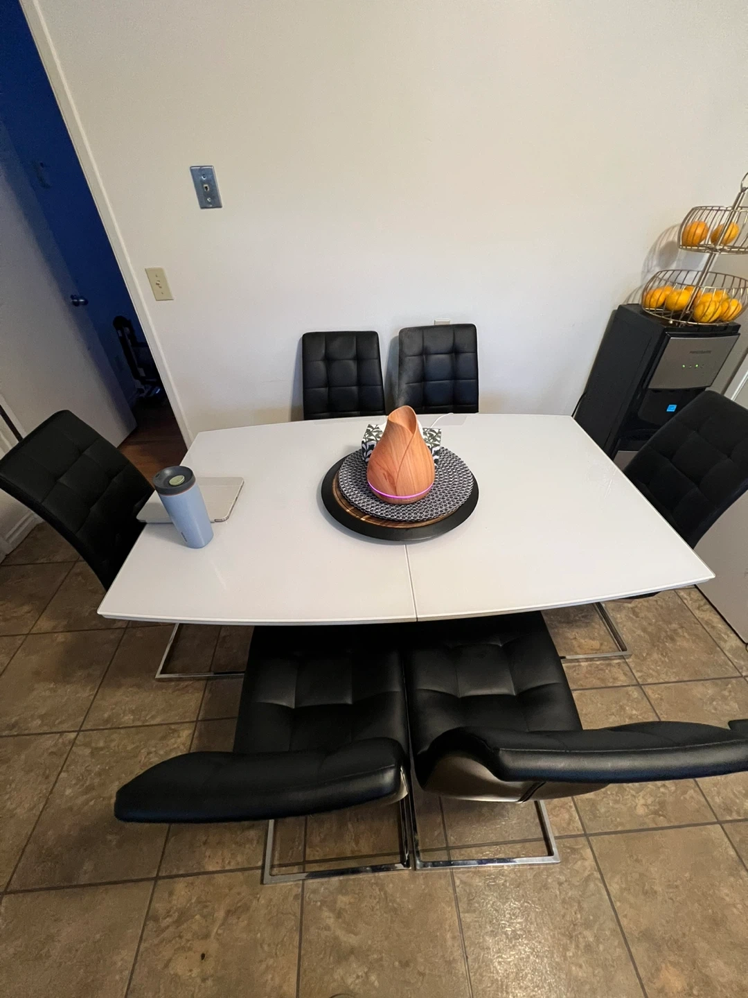 Selling a modern dining table with six chairs. The table is white and extendable, perfect for accommodating extra guests. The chairs are black with a quilted pattern and chrome legs. It's in great condition and ready for a new home!