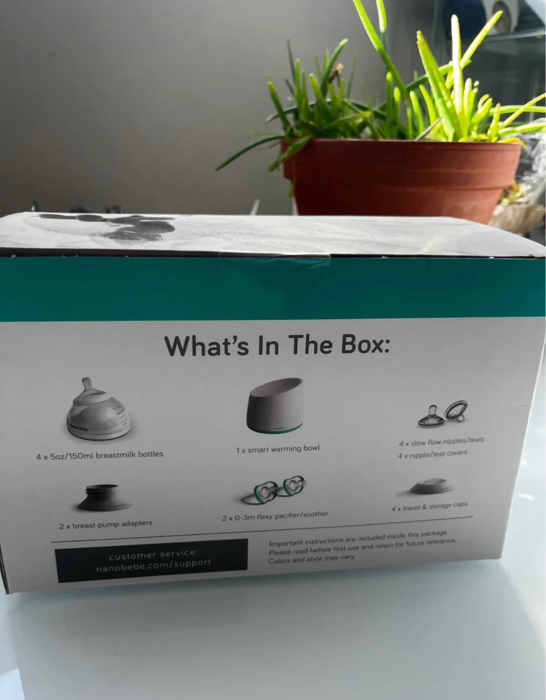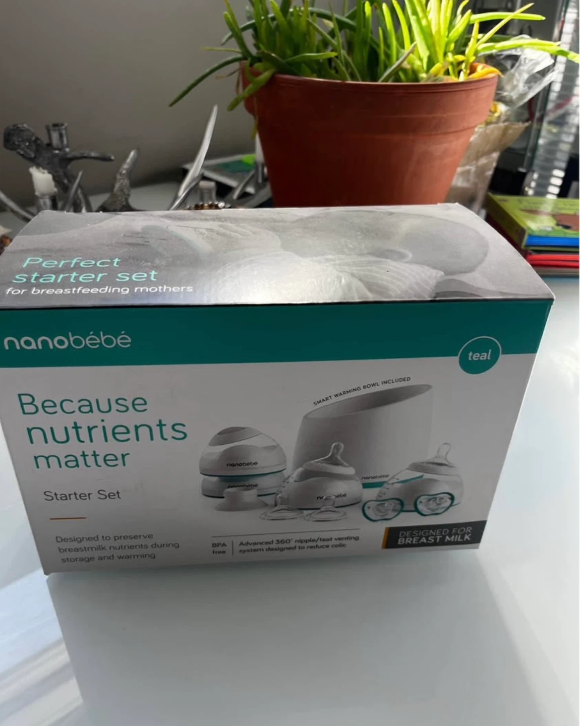 This Nanobébé starter set includes 4 x 5oz/150ml breastmilk bottles, 1 smart warming bowl, 4 slow flow nipples/teats, 4 travel & storage caps, 2 breast pump adapters, and 2 pacifiers. It's designed to preserve breastmilk nutrients during storage and warming.