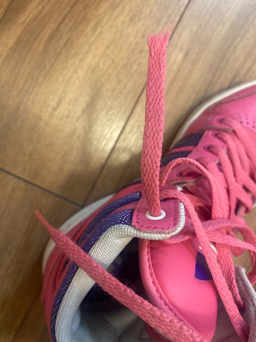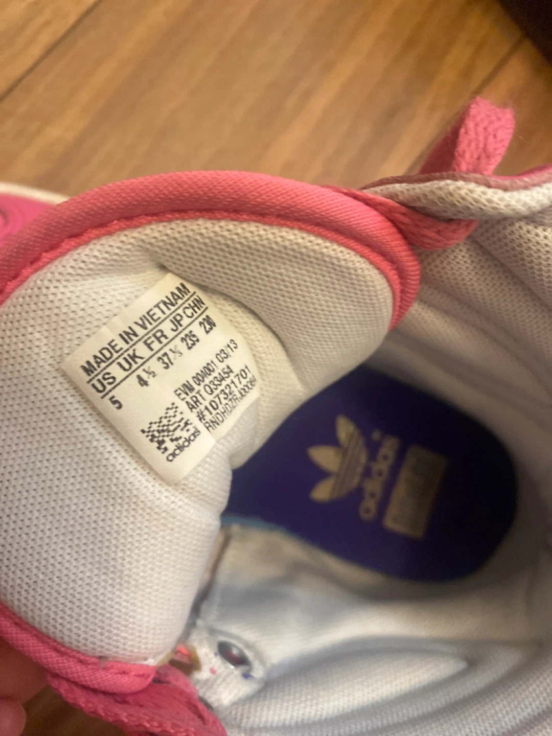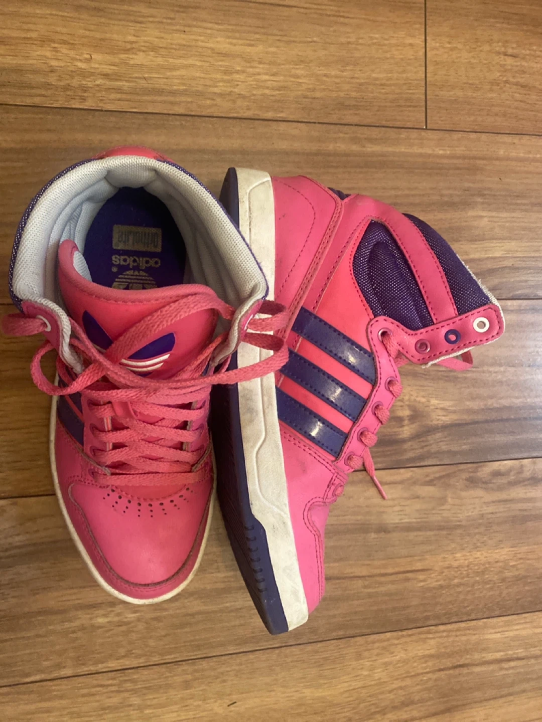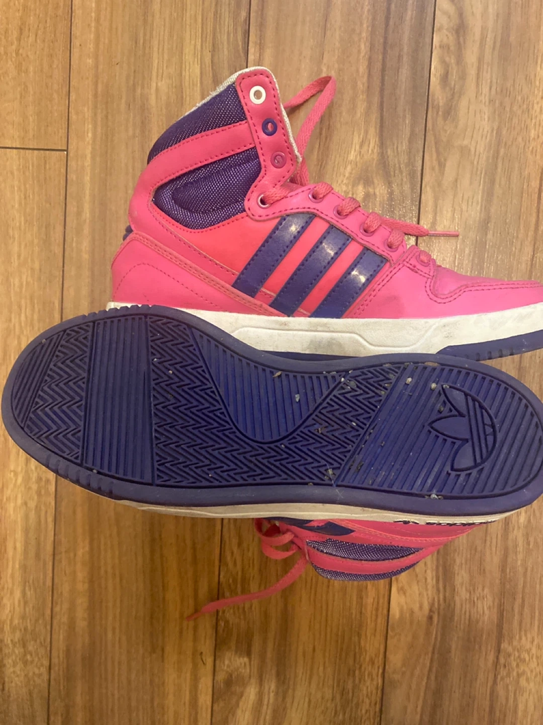 These Adidas high top sneakers are a fun pink and purple colourway. They're a youth size 5. The shoes feature the classic Adidas stripes and logo.shoe lace on right foot is missing plastic piece- hence low price.