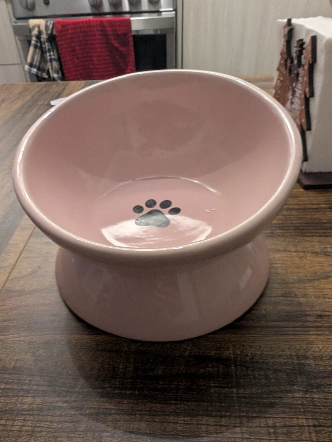 This is a pink ceramic pet bowl featuring a paw print design. It's designed to be a comfortable height for pets. Great for serving food or water to your furry friend!