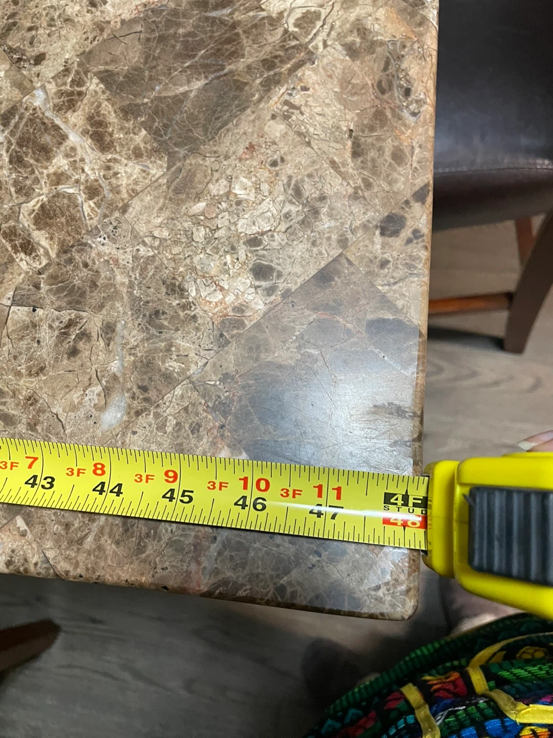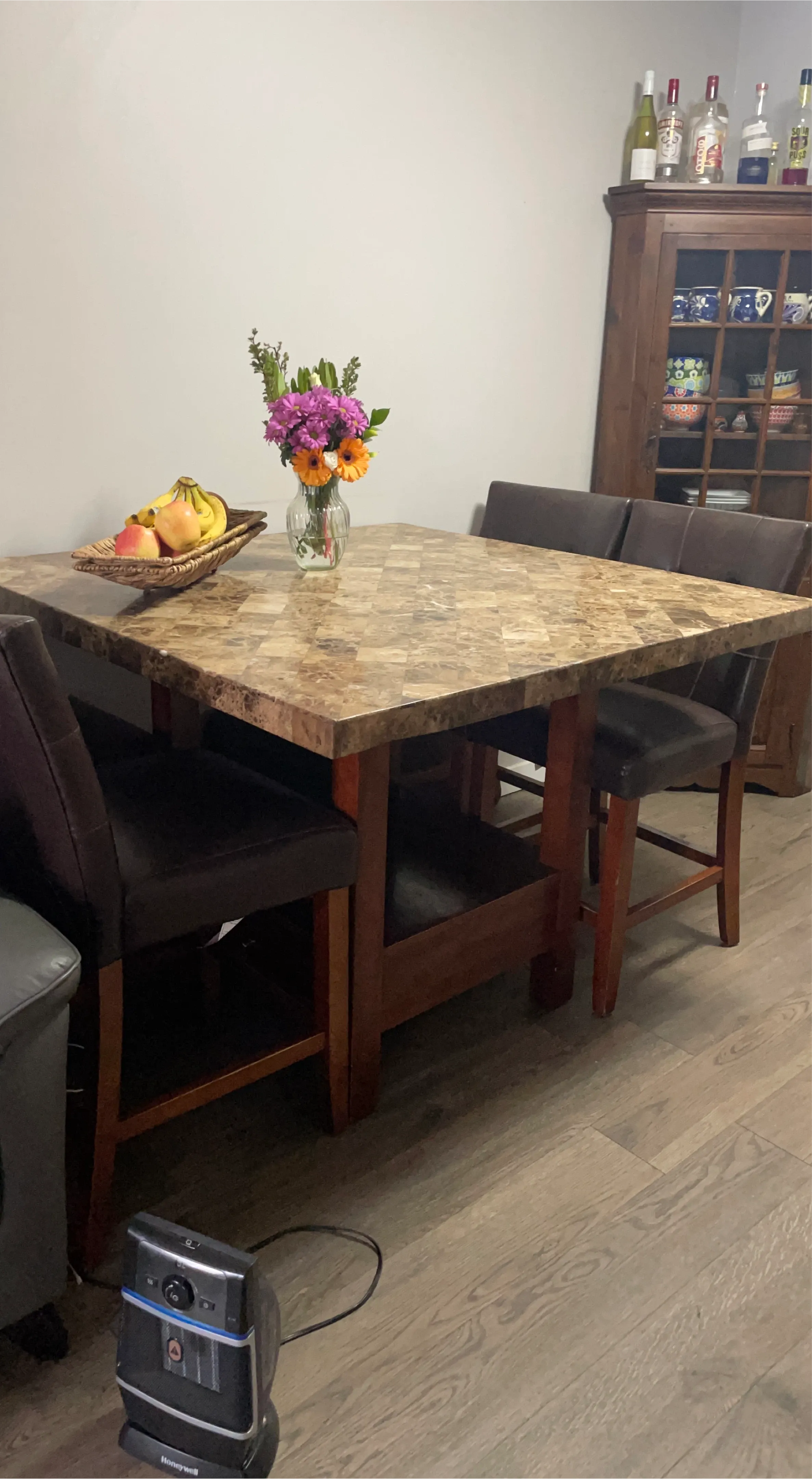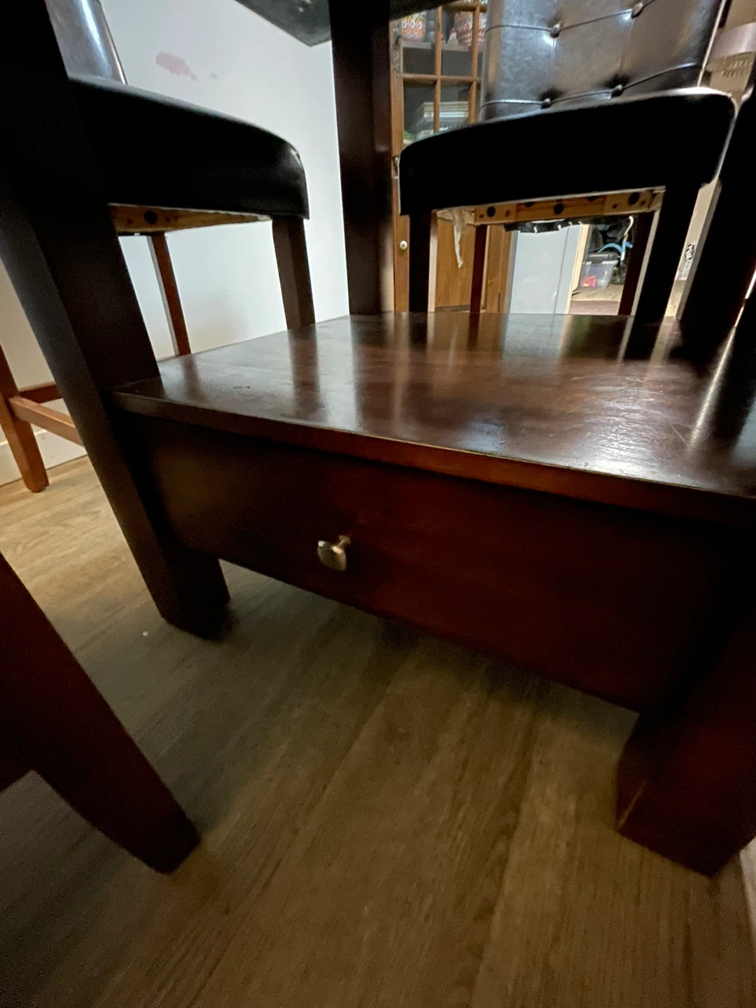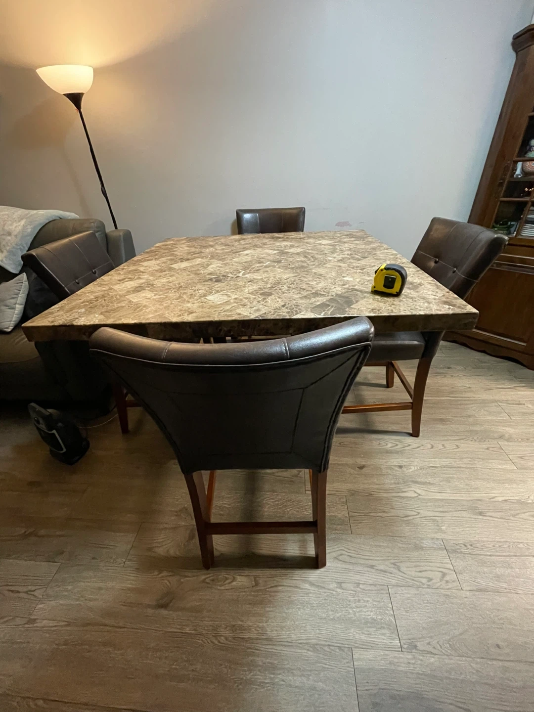 This dining set includes a table with a marble-look top and four upholstered chairs. The chairs are brown faux leather with tufted backs. The table has a wood base with a hidden drawer. This set is great for family dinners or entertaining guests!