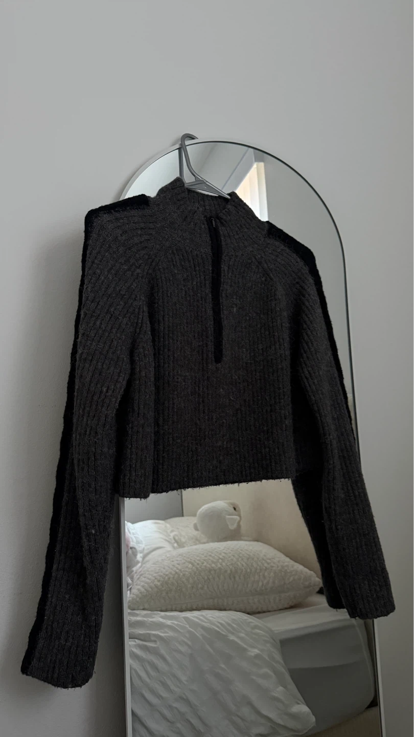 Oak + Fort Dark Grey Ribbed Cropped Sweater with Zipper - Size S