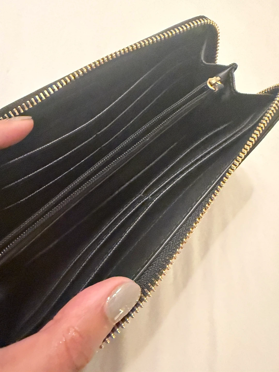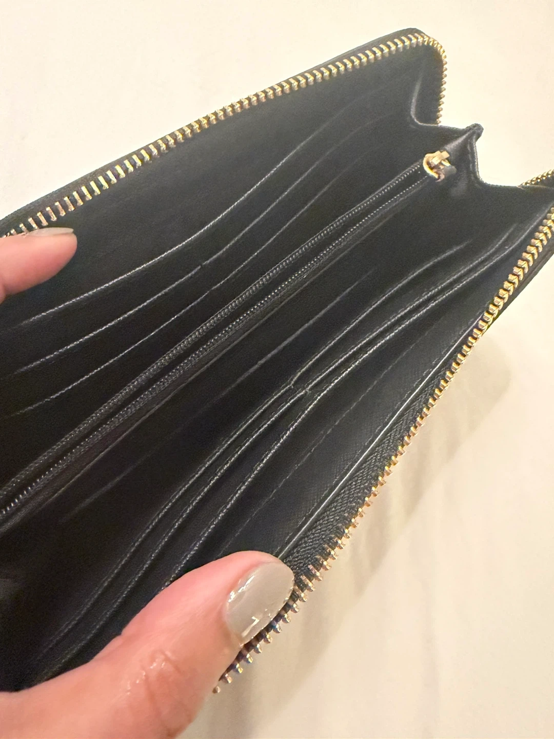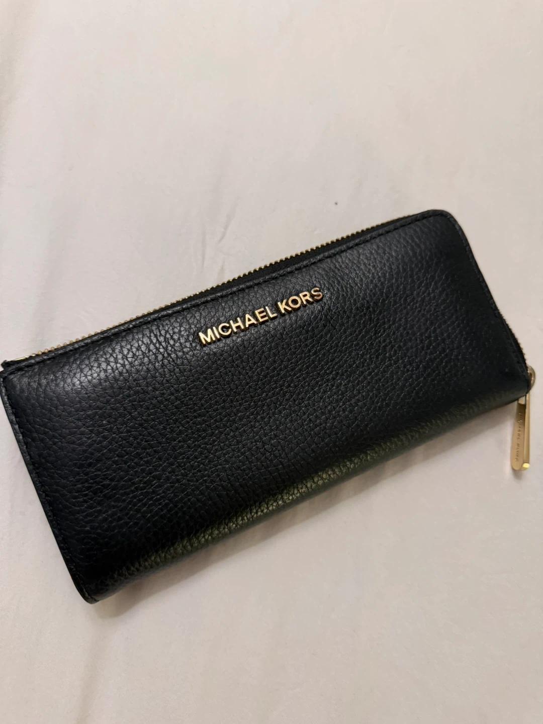 This is a Michael Kors zip-around wallet in black leather. It has multiple card slots and a zippered coin pocket inside. The gold-tone hardware adds a touch of class. It's a great wallet for keeping your essentials organized!