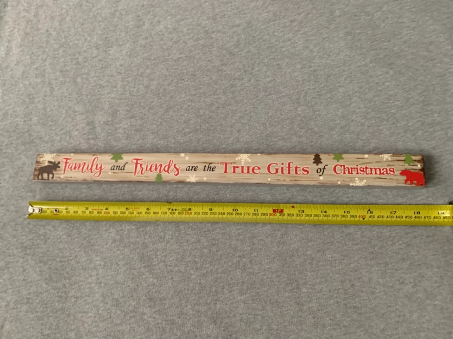 Wooden decor that says 'Family and Friends are the True Gifts of Christmas'. It's made of wood and measures about 18 inches long